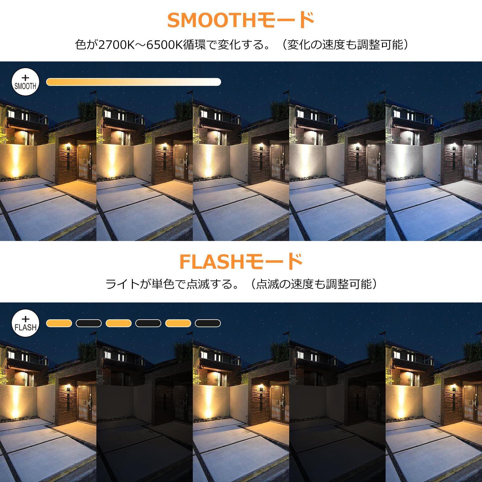 【リモコン操作便利:豊富な機能】リモコン付き、もっと豊富な機能を備えております。①ソーラーパネルが明暗センサーを搭載しているので、ライトは夜になると自動点灯、夜明けになると自動消灯、手間がかからず便利です。②2時間強制点灯モードあり、このモードでは昼夜を問わず設定すれば2時間点灯します。③色温度は6500K~2700K無段階調整することができます。またワンボタンで6500K/4000K/2700Kを切り替えることも出来ます。④タイマー機能付き:2時間/4時間/6時間点灯した後に自動消灯することを設定出来ます。⑤6500K~2700Kグラデーションモードと任意の単色が点滅するモードもあります。⑥制御ボックスでもリモコンでも高輝度・中輝度・低輝度に切り替えます。⑦メモリー機能付き:強制照明モード以外、他のモードでは記憶されて次の日から動作し続きます。例:6500K~2700Kグラデーションモードで6時間点灯をタイム設定すれば、これからの毎日にもこの設定で点灯します。
