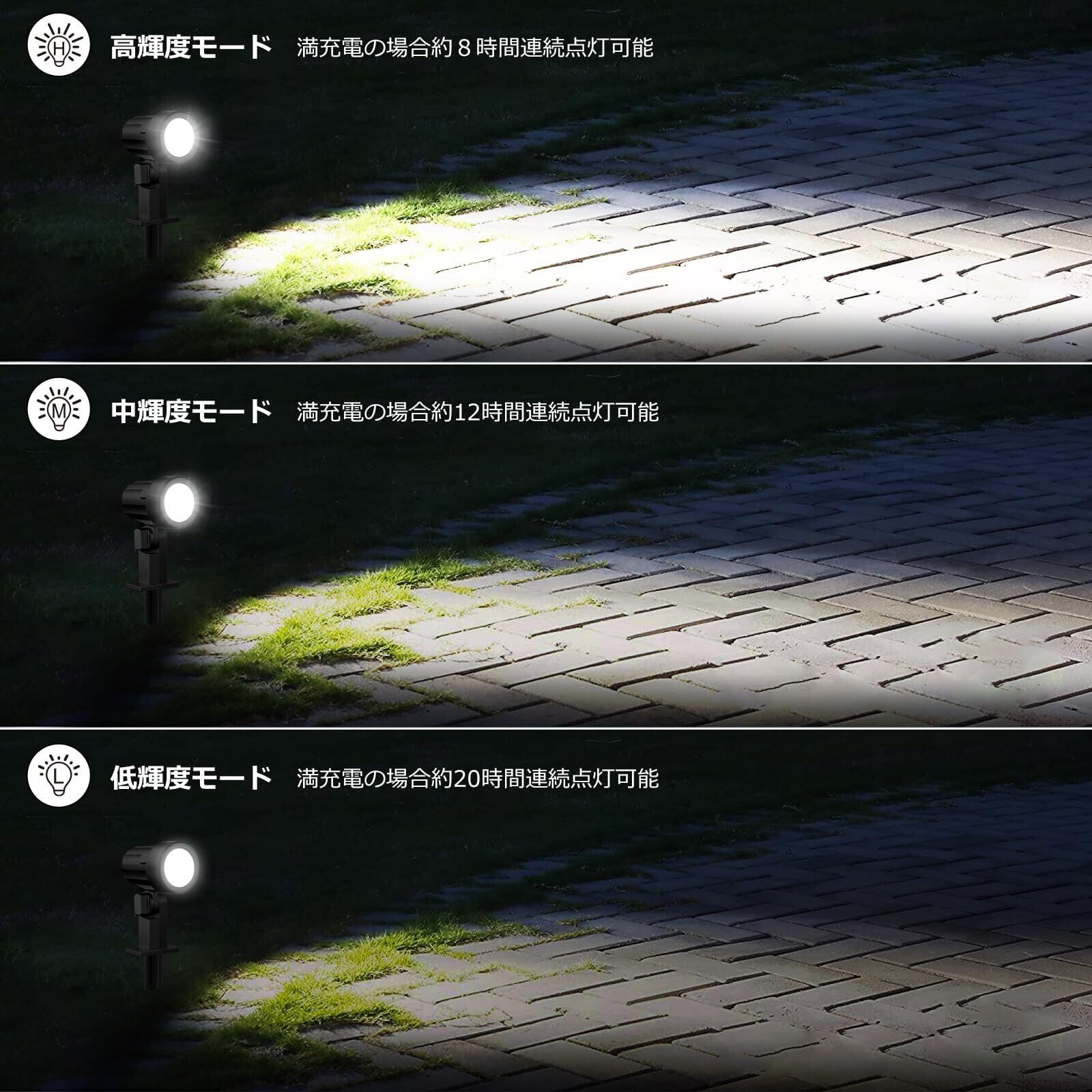 【分離型のガーデンライト、ソーラー充電で電気代ゼロ】ガーデンライト本体がソーラーパネルと別れているため、延長コードが総合約16.5Mが有り、お庭の形と大きさによる自由に設置できます。単結晶PETソーラーパネルを採用、直射日光を10時間ぐらい当てて、バッテリーをフル充電します。晴天一日充電したら中輝度モードで12時間以上連続点灯可能です。AC電源が必要なく、電気代がかかりません。【重要】ソーラーパネルの充電表示灯:赤点灯の場合、ソーラーパネルは正常にソーラー充電中です。消灯の場合、ソーラーパネルは充電しません。直射日光ではない場合もソーラー充電表示灯が赤点灯します。でも充電効率が低くて上手く充電できませんので、ちゃんと充電できるようにソーラーパネルを必ず直射日光を当てる場所に設置してください。