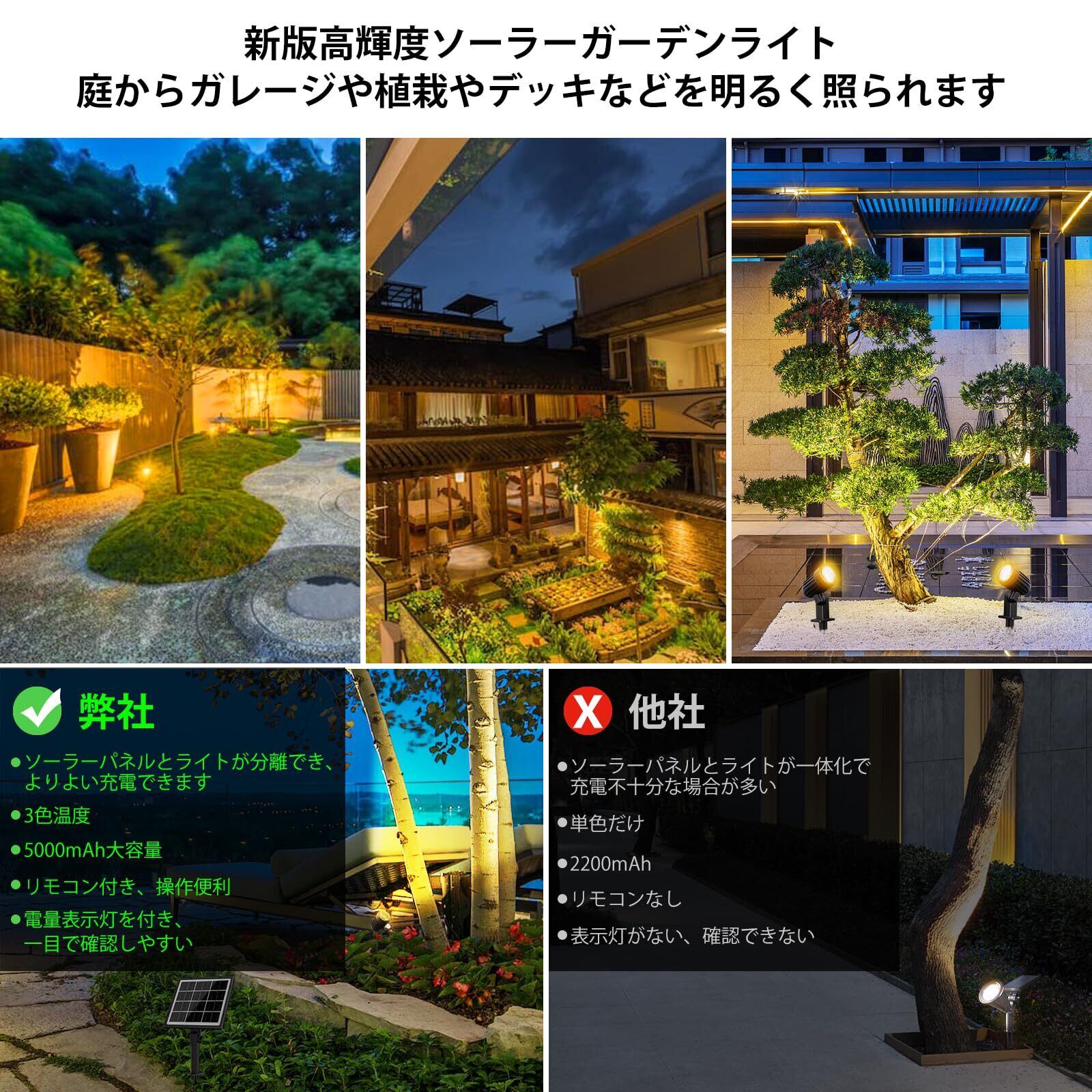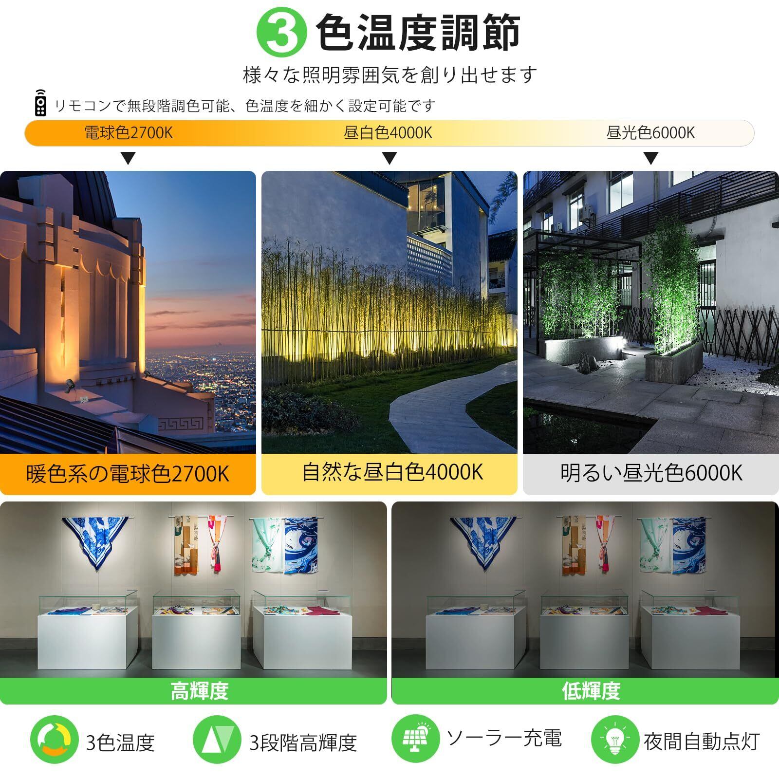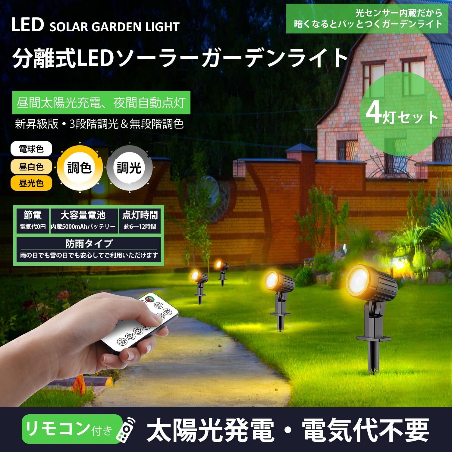 【新登場分離式ソーラーガーデンライト|昼白色/自然色/電球色3色切替|高輝度/中輝度/低輝度3段階調光|リモコン付き】この昇級版分離式4灯セットのソーラーガーデンライトは独特な3種類の色温度を切替の機能があり、事前に設置場所の環境によって、自分の目的にあった色温度を選ばれます。明るい昼光色6000K、自然な昼白色4000K、暖色系の電球色2700Kを切り替え、夜中で様々な雰囲気を作りすることが可能です。また、使用用途や目的や使用環境などによって、ソーラースポットライトは高輝度と低輝度の2段階の光量を調整可能です。商品の仕様:LED個数:4個 色温度:3種類(電球色/昼白色/昼光色) 輝度:2段階(高輝度:全光束200LM*4個=800LM/低輝度:全光束:300LM) コードの長さ:全長14m ソーラーパネル:6v/4w 防水仕様:IP66 点灯時間:約6-12時間 用途:庭のライトアップ、クリスマスなど季節の飾り用、玄関付近や裏口など防犯対策に