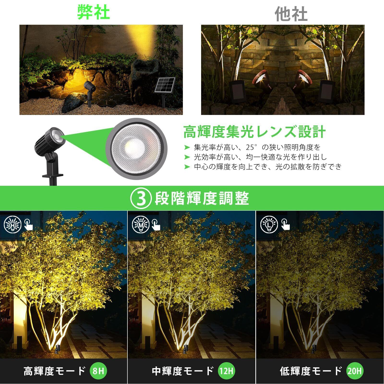 【高輝度集光レンズ|改良版大容量電池|電量残量表示灯を付き】このソーラーガーデンライトは高輝度の集光レンズを搭載して、もっと均一で非常に明るいチップ式透過照明を実現することができます。集光角度は25°で集光性は高い、以前より明るくなります。庭にアップして、昼間とは違う魅力を感じています。改良版大容量の電池を配置して、満充電のとき、高輝度の場合は最大点灯時間は6時間で、低輝度の場合は最大点灯時間は12時間です。ソーラーパネルが日中太陽光で約10時間フル充電し、約6-12時間を点灯できます(充電時間と照明時間が天気によって変わっています)。電池ボックスの正面は電池残量のパーセントが表示灯があり、電池の残量を便利に確認することができます。二つの輝度も表示灯もあり、どんな輝度で簡単に判断します。また、電池とソーラーパネルの動作ランプがあり、どちらは稼働不可の原因をわかりやすいになります。