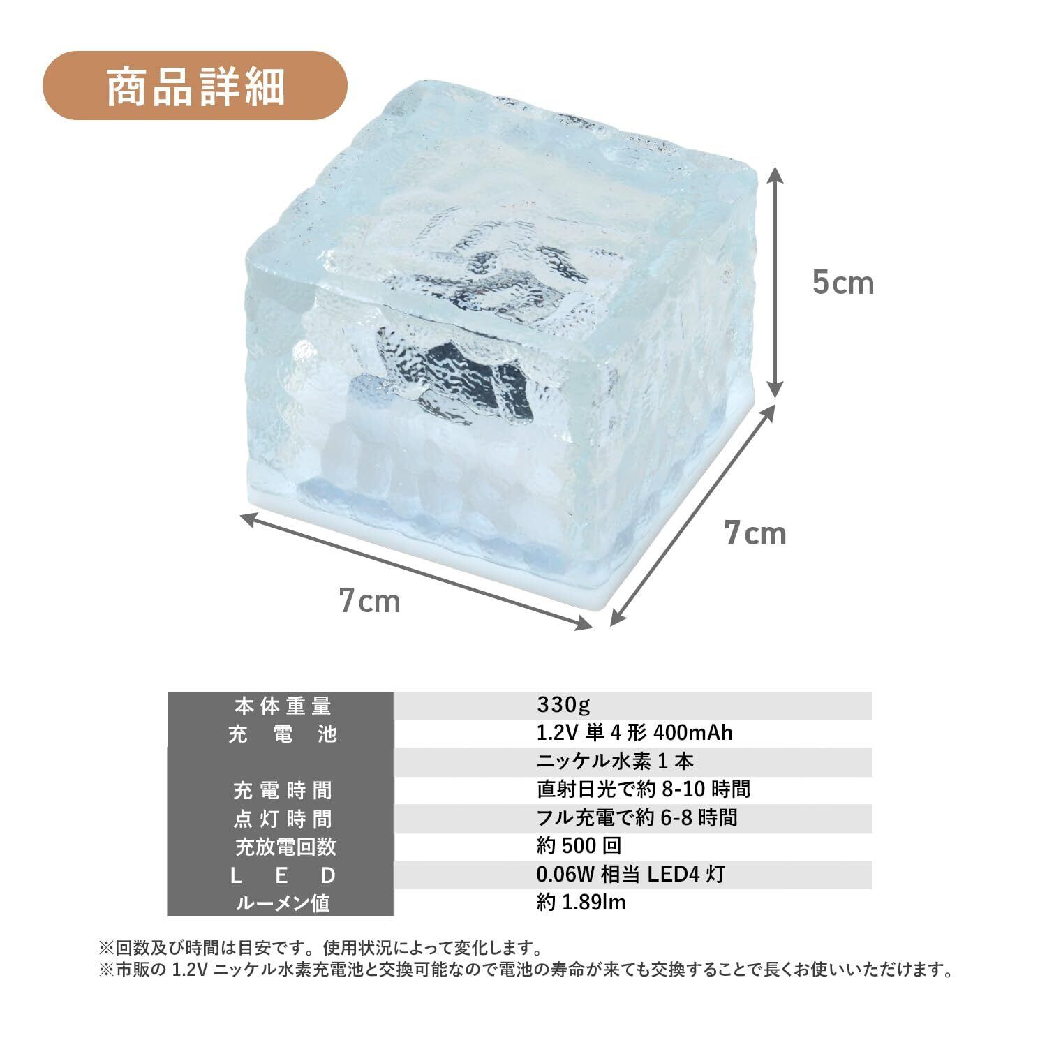 【仕様】本体サイズ:幅7×奥行7×高さ5cm/防塵防水性能:IP66/充電時間(目安):直射日光で約8-10時間/点灯時間(目安):フル充電で約6-8時間/LED:0.06W相当/充電池:1.2V 単4形 400mAh ニッケル水素 1本/カラー:ホワイト/数量:1個