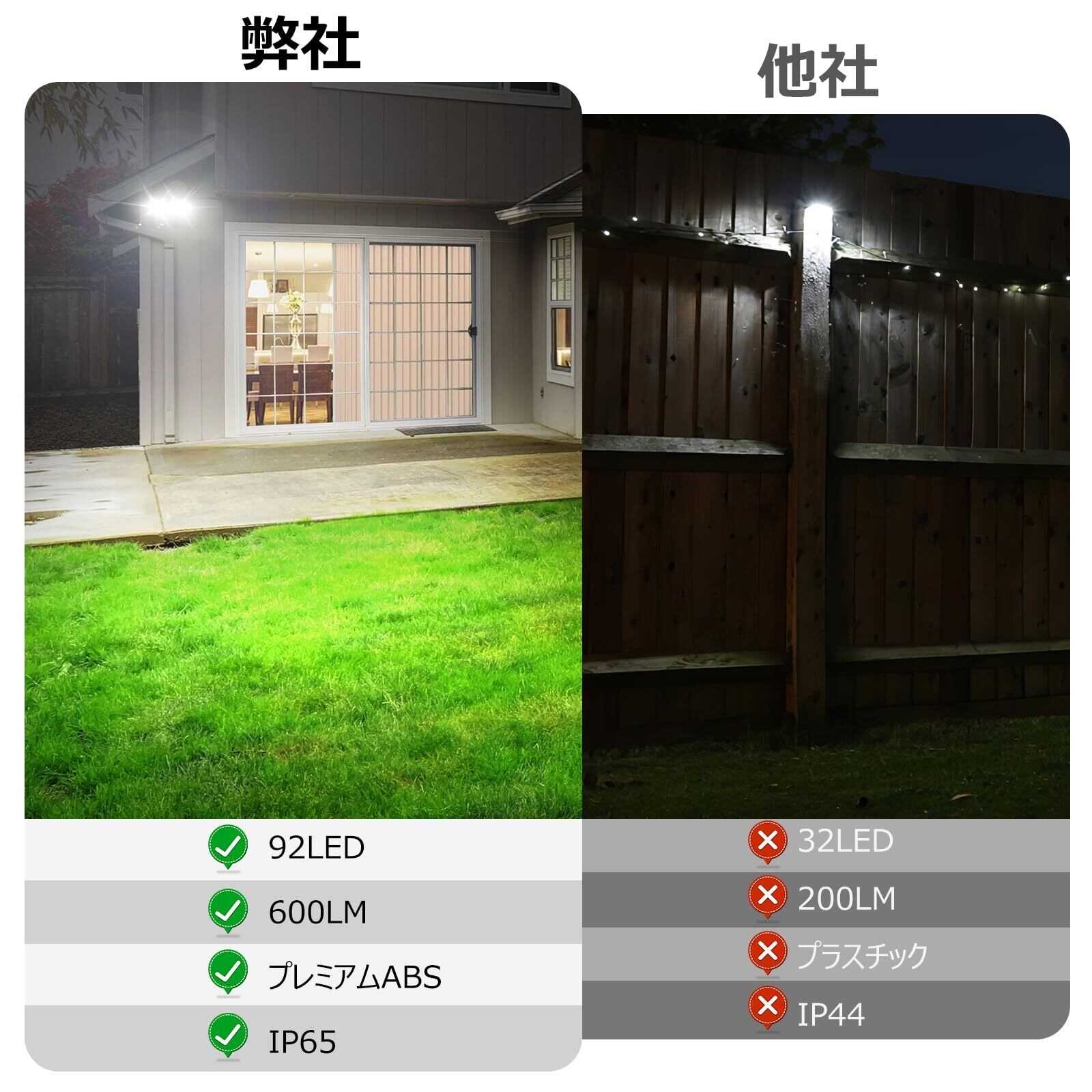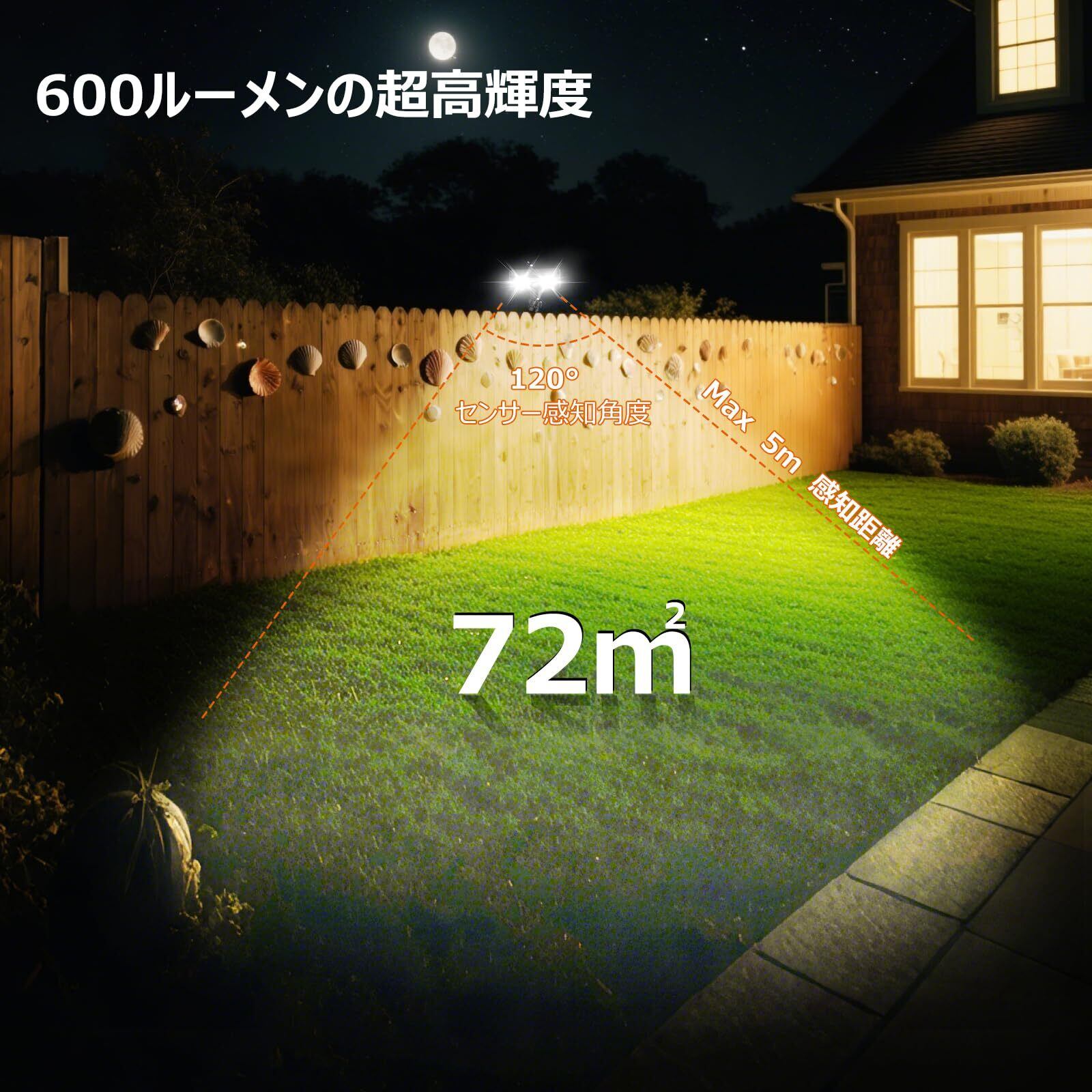 600LM超高輝度&広範囲照明:92個の高品質LED搭載で、600ルーメンの明るさを実現。最大5mの感知距離と120°の広いセンサー角度で、庭や玄関を明るく照らします。