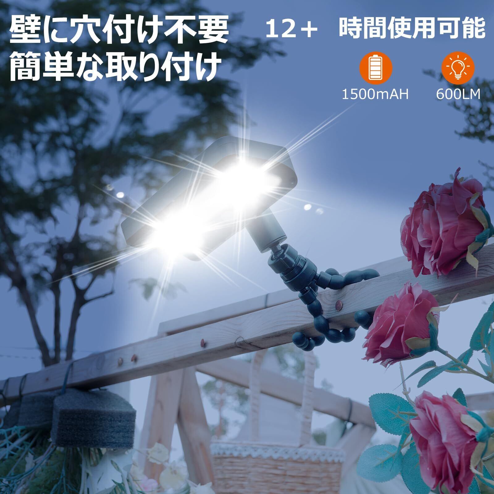 太陽光充電&長時間使用:1500mAh大容量バッテリー内蔵で、12時間以上の連続使用が可能。人感センサー搭載で電力節約し、効率的に稼働します。