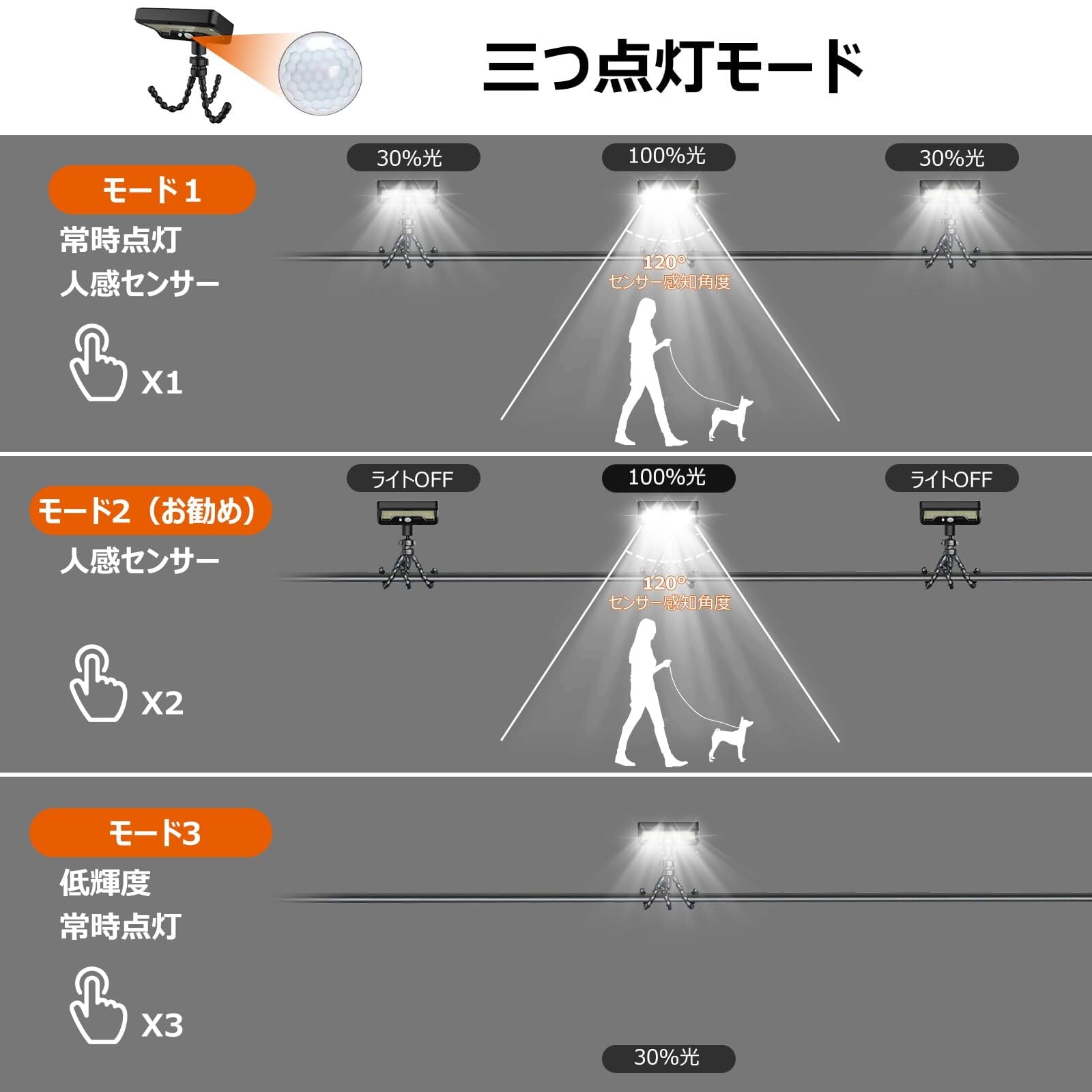 3つの点灯モードで柔軟に使用:モード1:常時点灯(人感知時30%→100%に切り替え)モード2(おすすめ):人感知時のみ100%点灯(省エネ優先)モード3:常時30%低輝度点灯(常夜灯として最適)