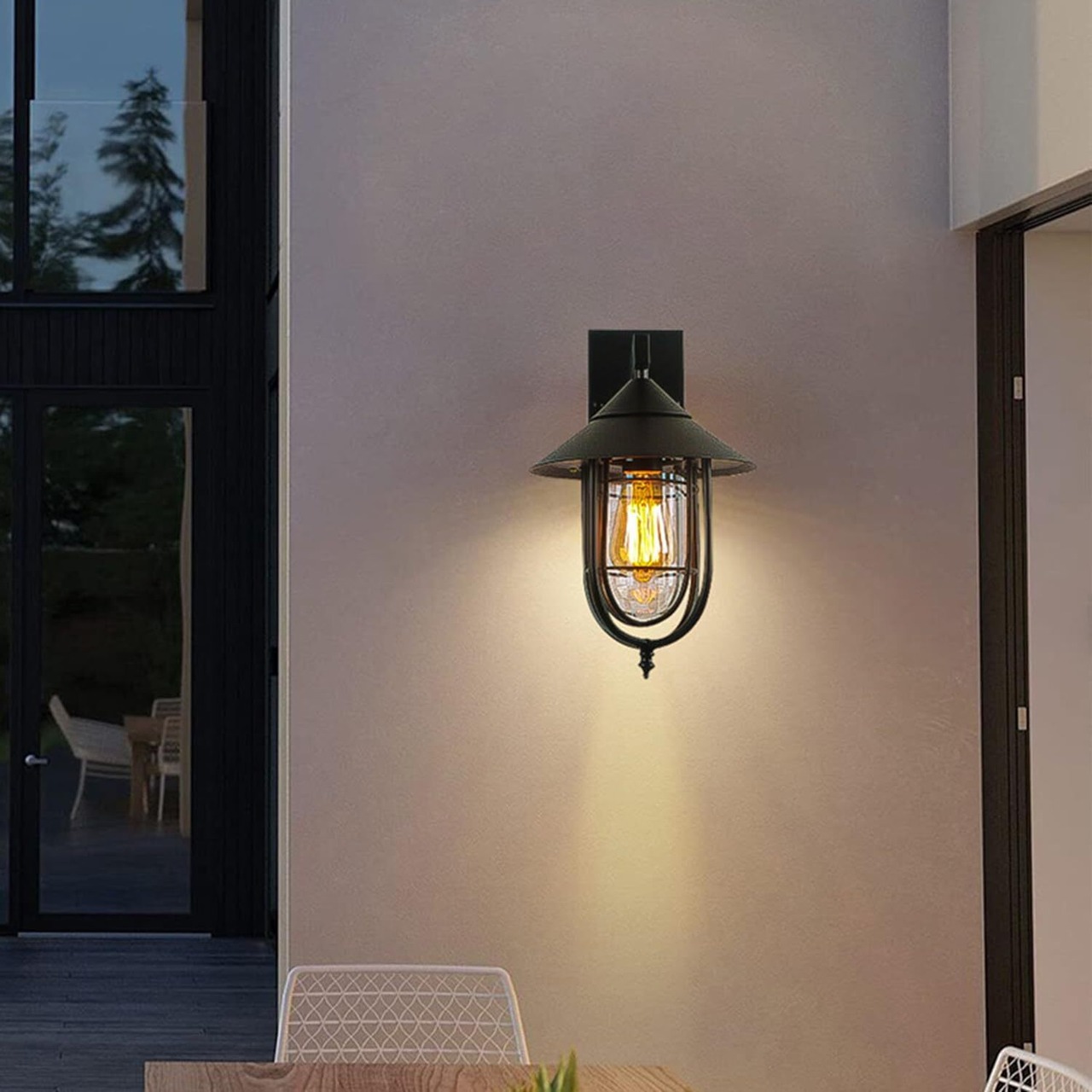 【商品仕様】外灯 屋外のサイズ:25*30cm 素材:アイアン、ガラス、カラー:ブラック 重量:1.2kg 入力電圧:110V 電球口金:E26*1(電球なし)、最大60W(電球別売、ガラス電球カバー付き)取り付ける電球によって雰囲気も変わるのでお好みの電球をお楽しみいただけます。