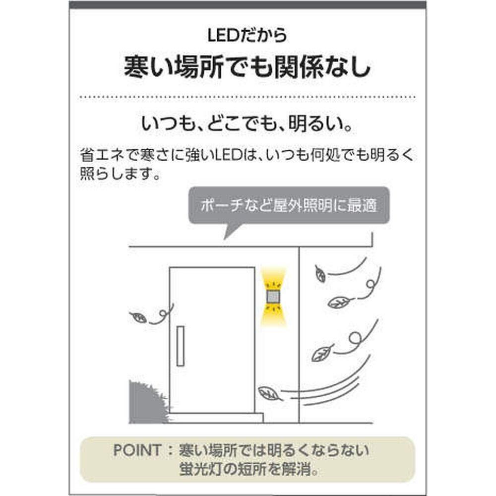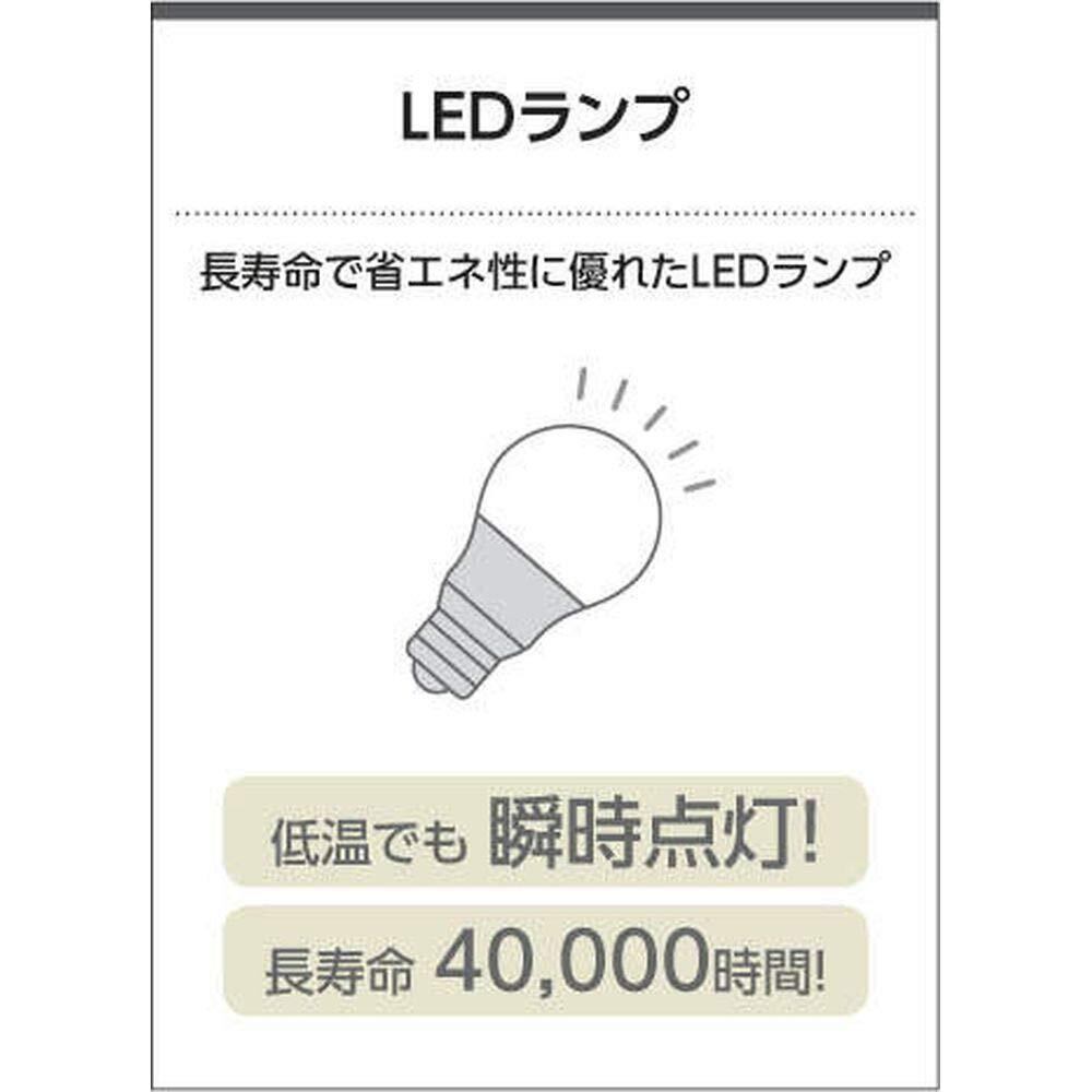 ●人感センサ付<br>●タイマーON-OFFタイプ<br>●白熱球60W相当<br>●電球色<br>●LED付<br>●速結端子付(送りなし)<br>●消費電力:5.3W<br>●色温度:2700K<br>●演色性:Ra84<br>●定格光束:350lm<br>●固有エネルギー消費効率:66.0lm/W<br>●電球形LEDランプLDA5(E26)<br>●アルミダイカスト:黒色塗装