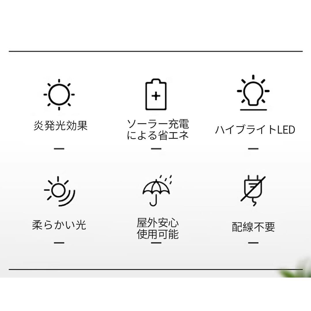 【省エネ&ソーラー充電】電気不要、配線不要、ソーラーフォトボルタイック照明、環境に優しく低電圧で安全。ポリシリコンソーラーパネルを使用して、高転換率、高充電速度、省エネルギー、環境保護、および省電力などが実現できます。(ご注意:本製品は主に装飾用ライトとして、揺らぎ炎のように点灯してます。静止画像だと、表現できないため、実写動画をご覧下さい。)