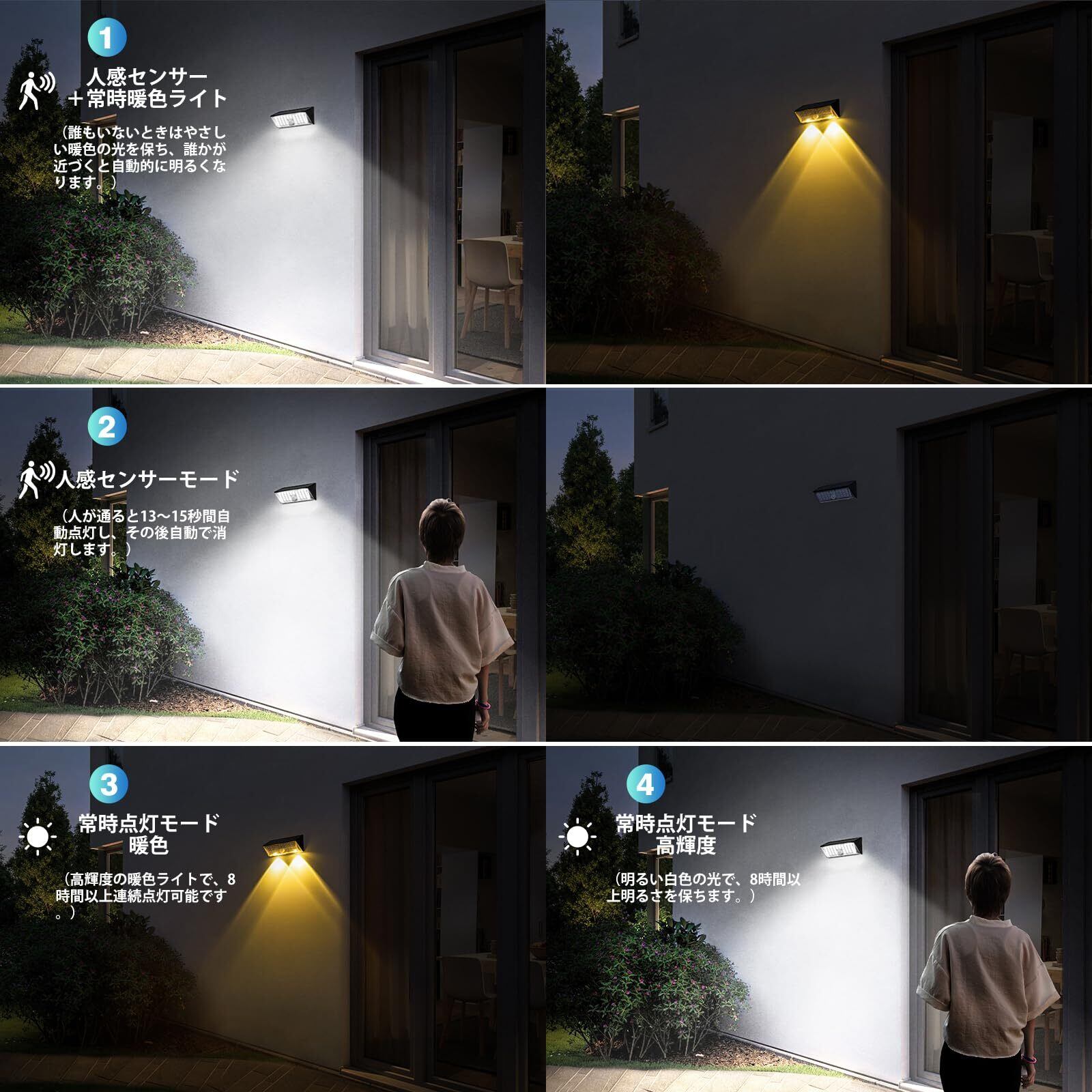 【選べる4つの点灯モード】:①人感+常時暖色:普段はやさしい光、接近時に13〜15秒間明るく点灯②人感モード:人を感知すると自動点灯③常時暖色モード:8時間以上やわらかい光を持続④常時強光モード:8時間以上パワフルに照射。用途に応じて自由に選べ、センサーライトとしても実用的です。