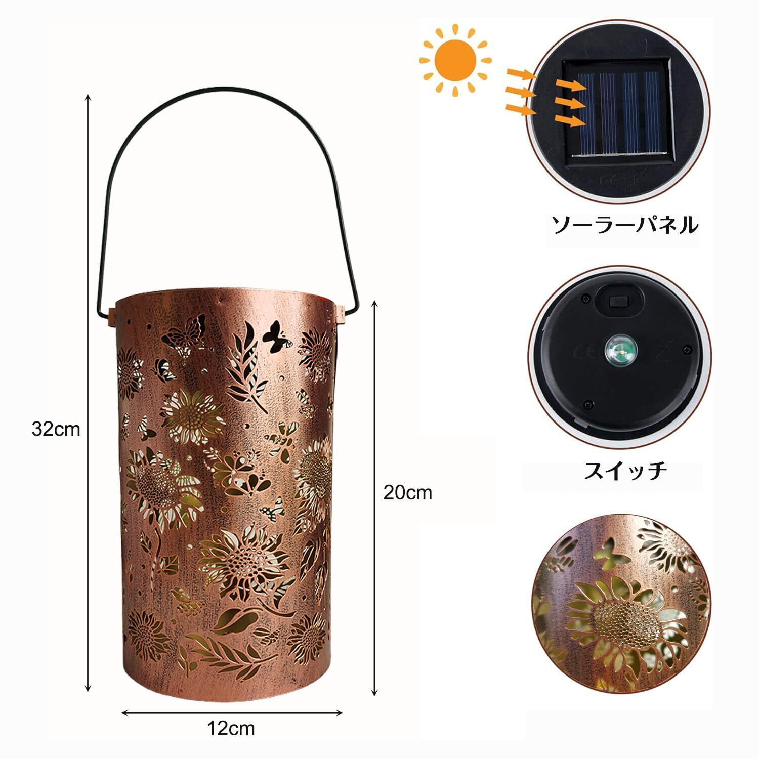 設置は簡単:配線やコンセントなど不要で、日当たり良い場所を選んで、 フタの裏のスイッチをONにしたまま、使いたい場所に吊り下げても置いても設置可能、とても便利なランタンです。