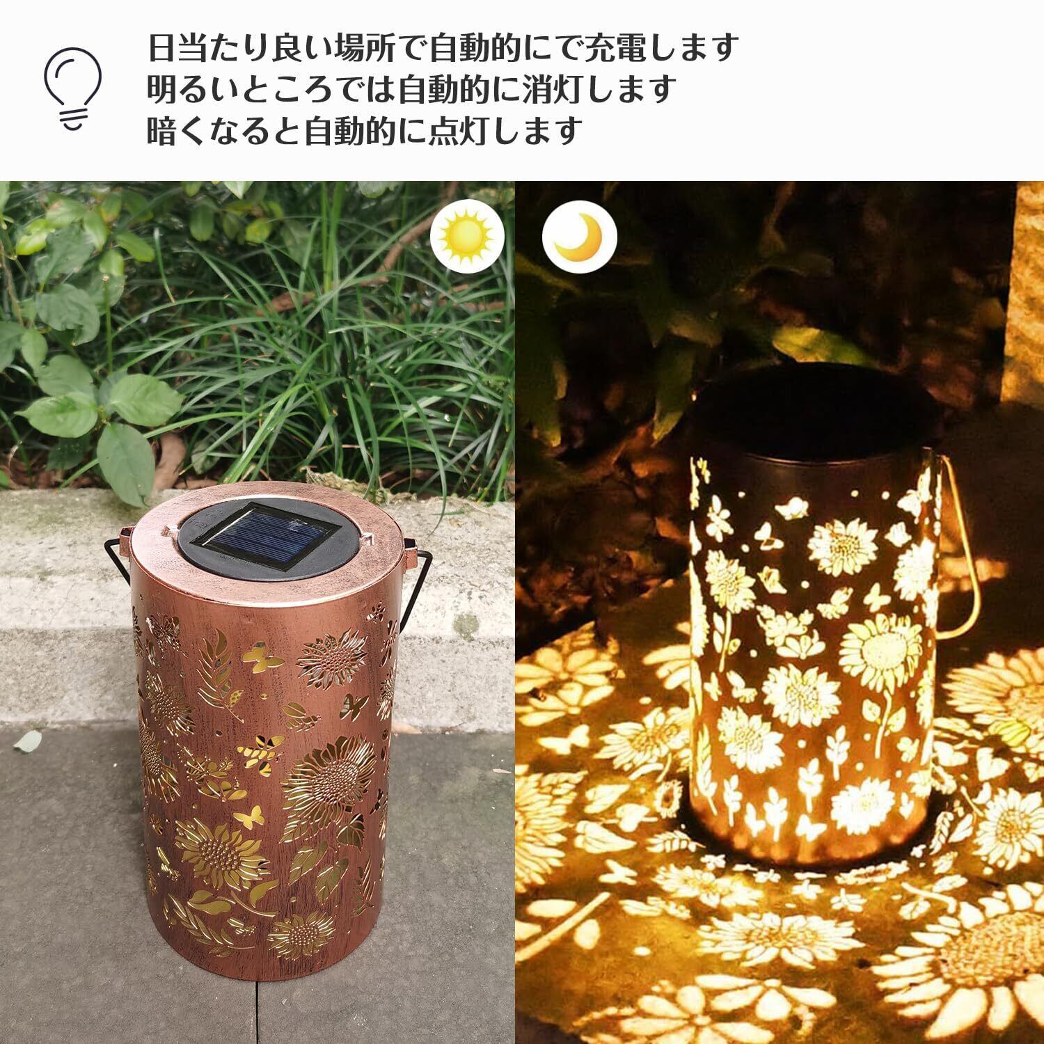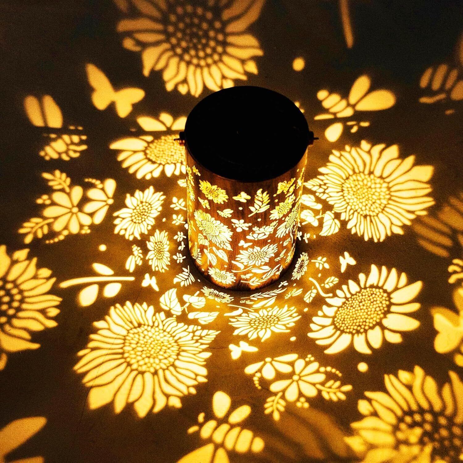 オシャレなソーラーランタン:シンプルなデザインですが、ライトを点灯すると透かし模様が美しく浮かび上がり、とても魅力的です。夜になると、可愛らしい花が咲き、幻想的な光と影を演出してくれます。
