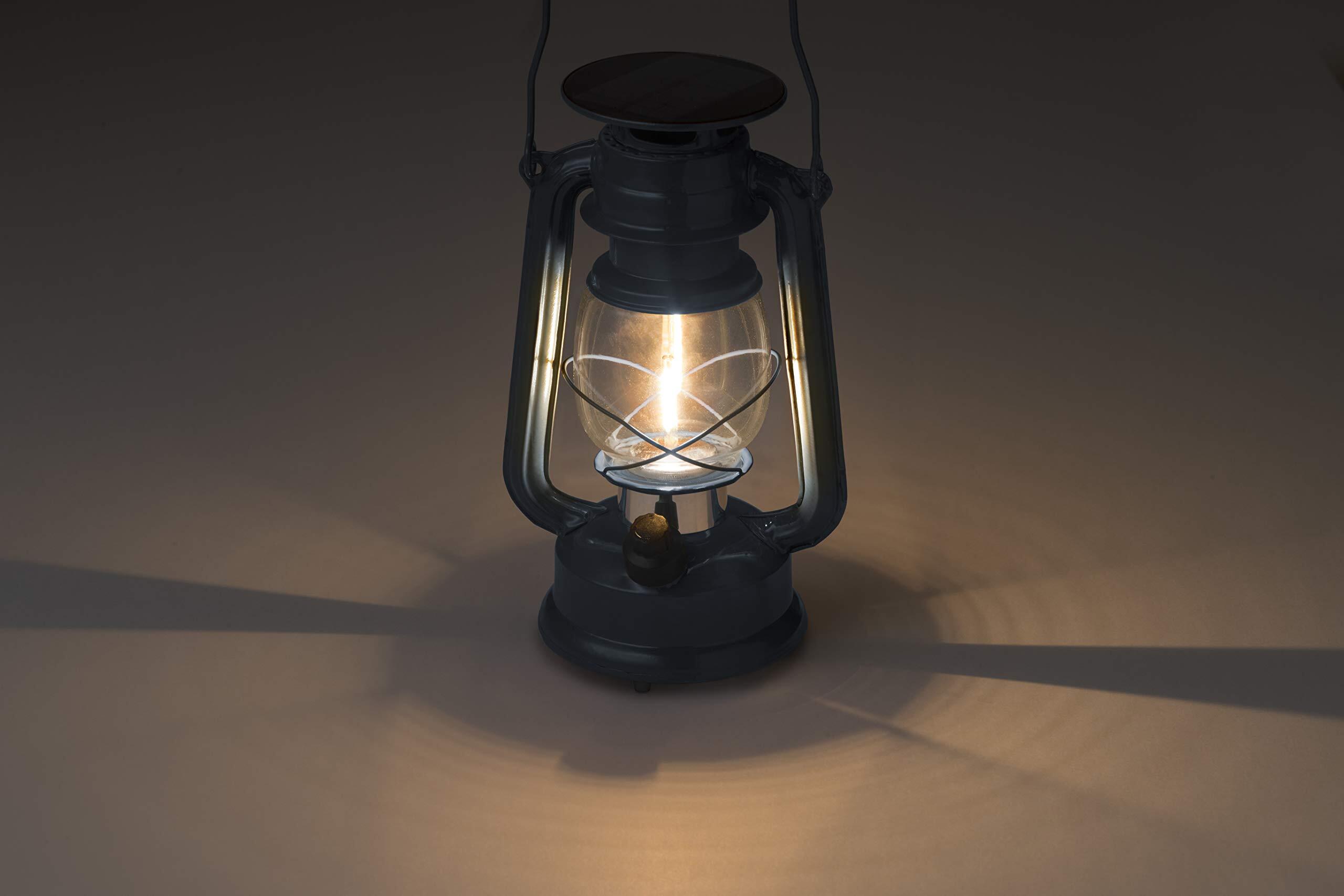 レトロでやさしいひかりのソーラーライト。リラックスした雰囲気を演出してくれる灯り。よりよい家族との時間をお過ごしください。工事不要の簡単設置。ソーラーライトだから電気代0円。太陽光で発電するので、電気代は不要です。さらに点灯後6時間経つと自動で消灯する機能もついています。フィラメント型LEDが使われているのでレトロ感のあるやさしいひかりが特徴的です。オイルランタン風のおしゃれなデザイン。火を使わないランタンなのでインテリアとしても飾っていただけます。「自動点灯消灯機能」で、暗くなったら自動的に点灯します。付属の「遮光カバー」を使用すれば、明るい場所でも点灯させることができます。うれしい調光機能付きで、明るさはダイヤル式スイッチで調節可能。2通りの充電方法・・・「ソーラー充電式」⇒日中、ソーラーパネルが太陽光を電気エネルギーに変換し、内蔵バッテリーに蓄電。「USB充電(補助充電)」⇒暗い、点灯時間が短いといった場合に補助的にUSBで充電が可能。マイクロUSB(B type)コードのみ付属。※USB充電器(DC5V/2A)が別途必要です。