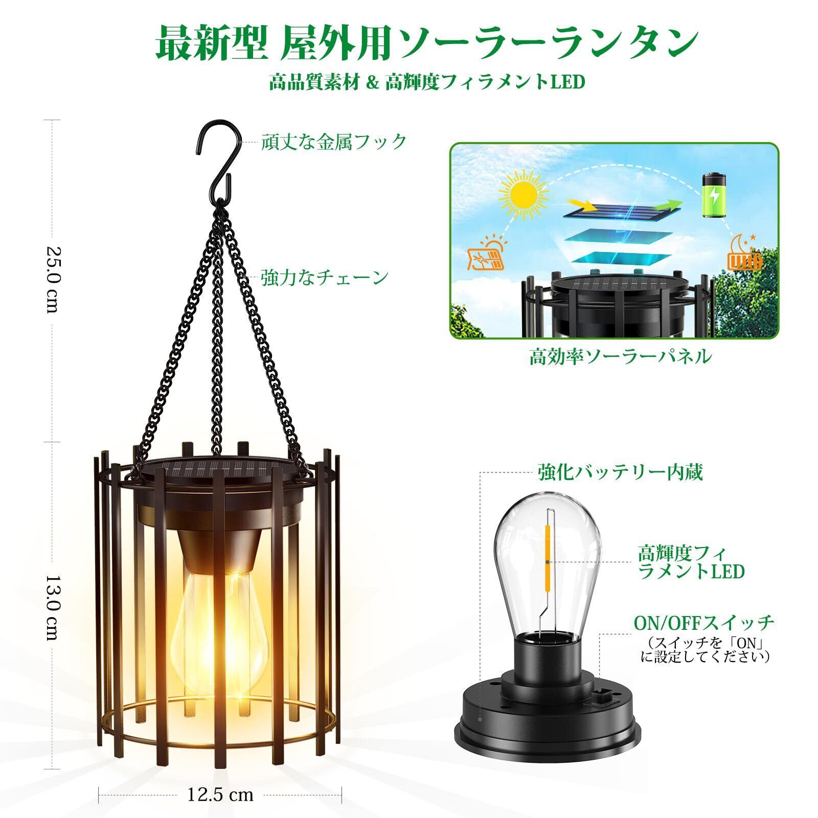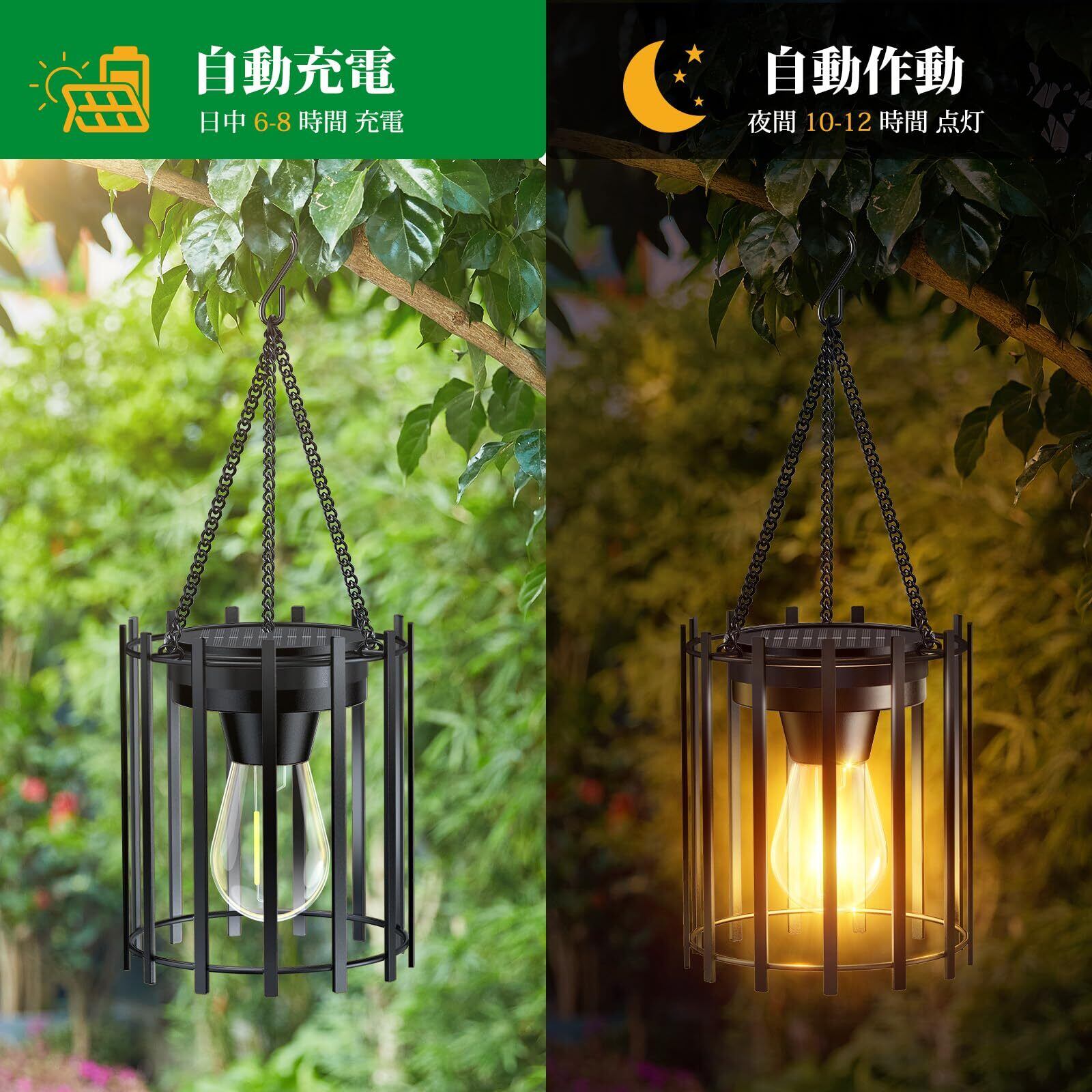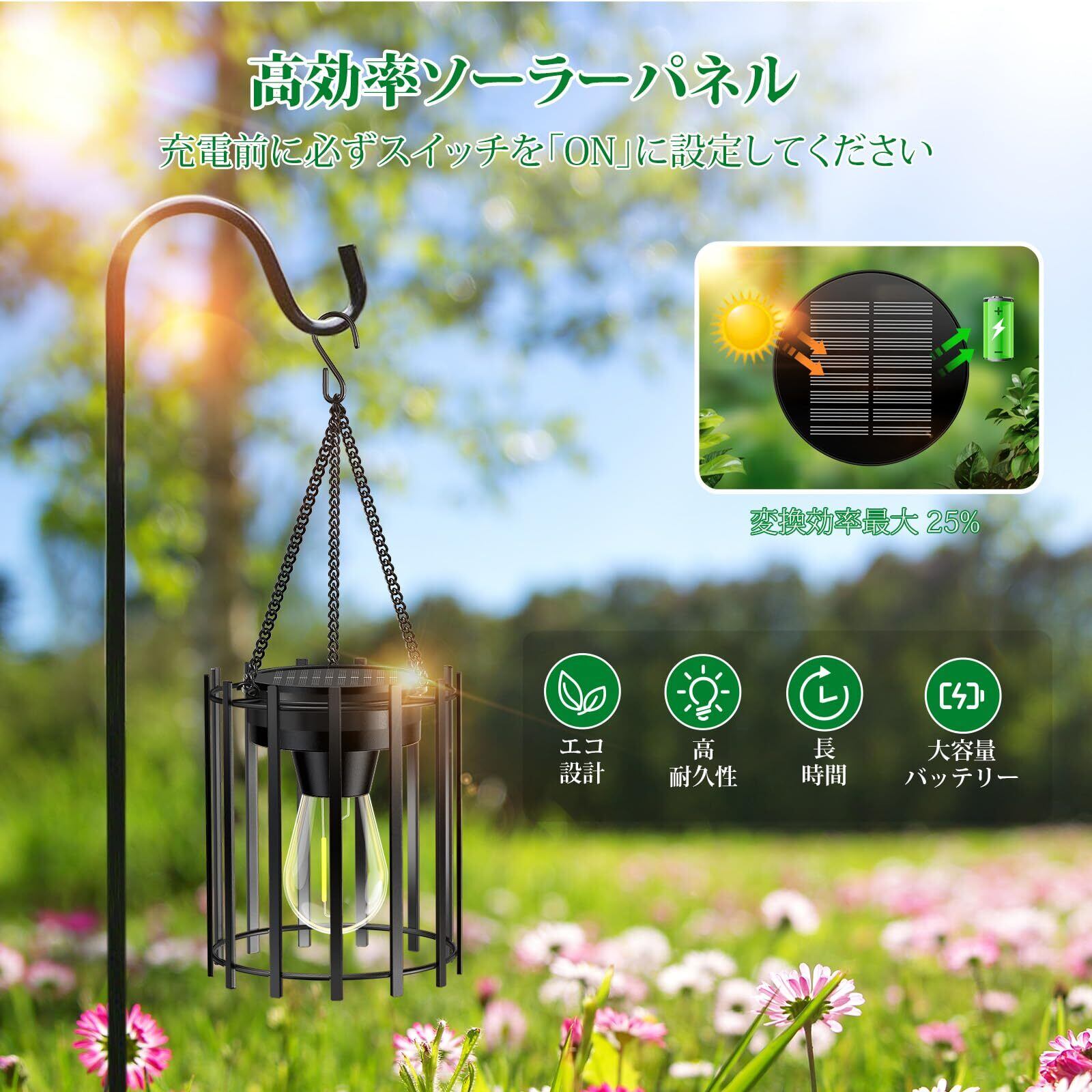 【耐久性に優れた屋外デザイン】高品質金属素材と強化チェーンを採用したフック付きソーラーランタン。厳しい屋外環境にも耐える防錆処理と頑丈な構造で、庭やキャンプでの長期間使用に最適です。高効率ソーラーパネルと大容量バッテリーを搭載し、高輝度フィラメントLEDが最大12時間の連続点灯を実現。直感的なON/OFFスイッチで操作が簡単で、雨風にさらされる場所でも安定した明るさを提供します。
