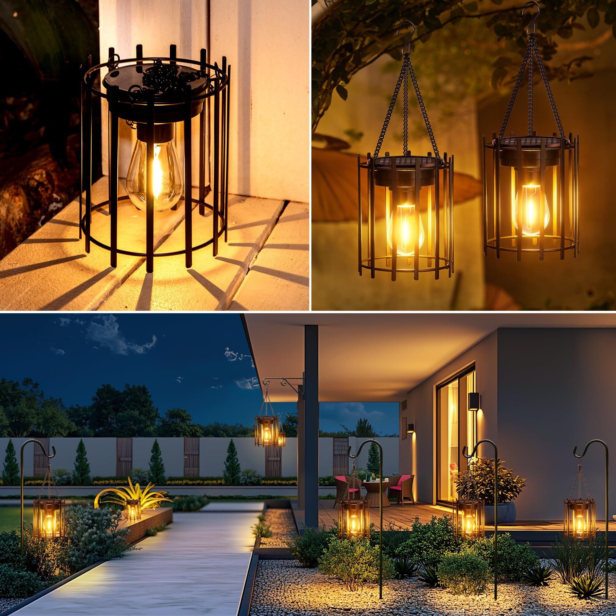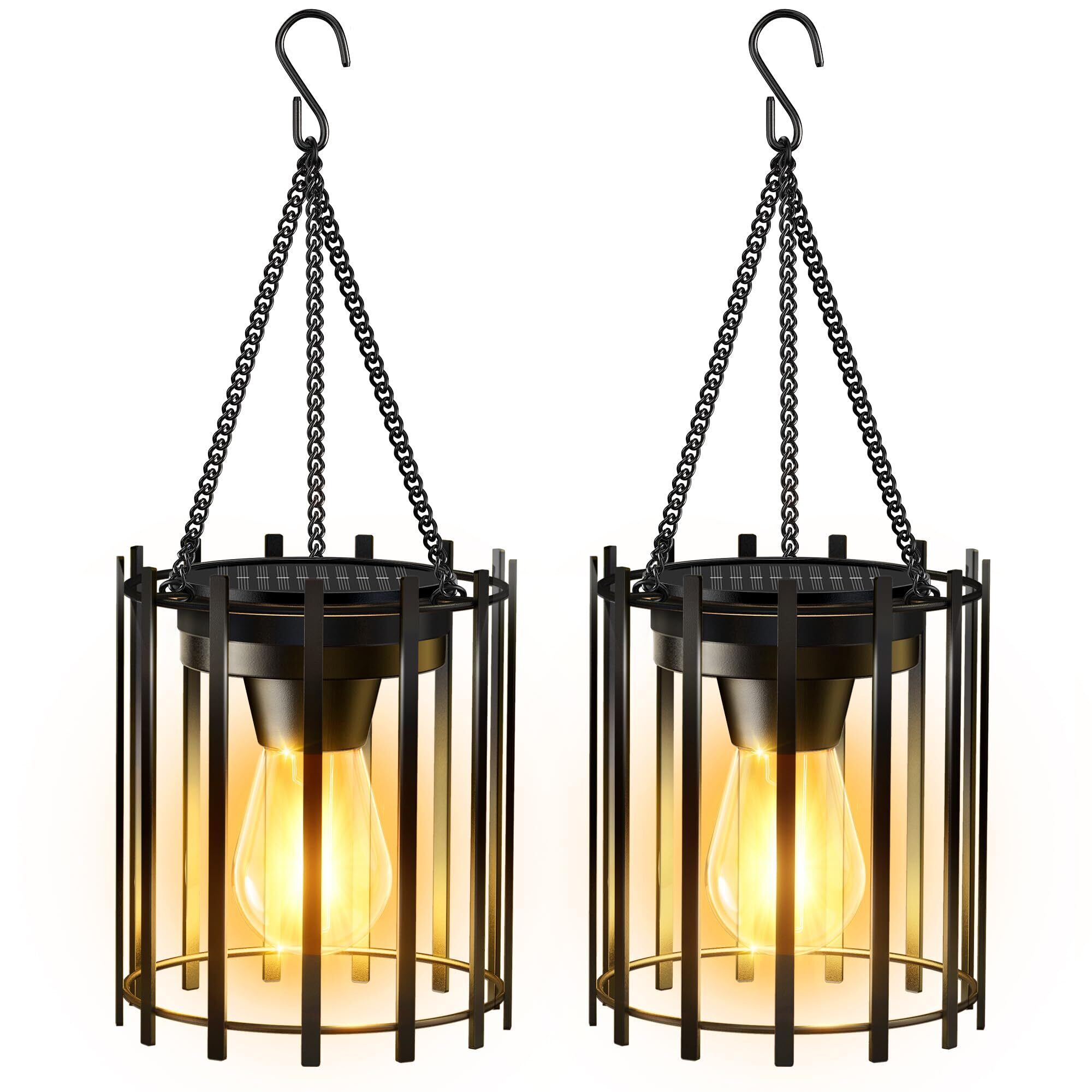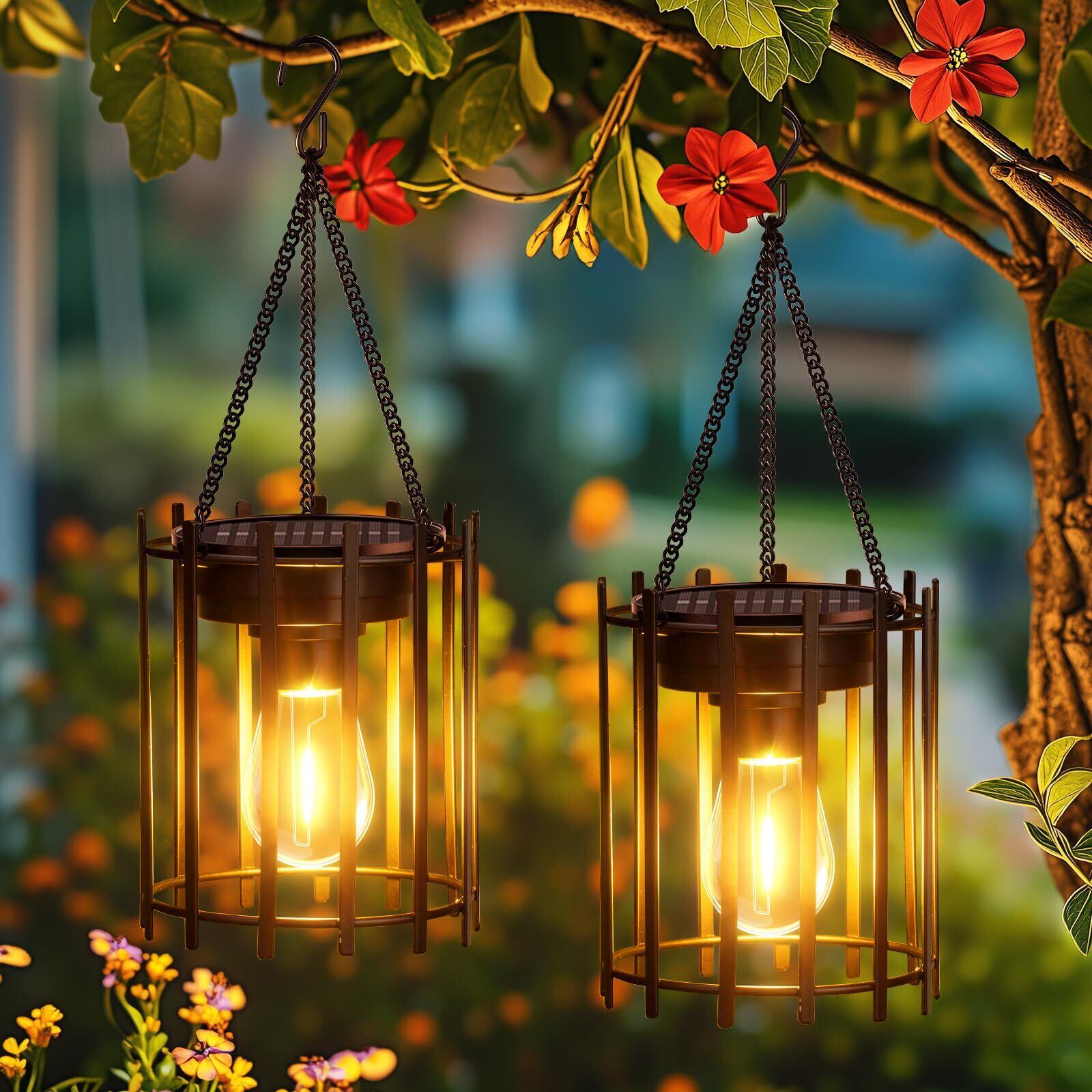 【耐久性に優れた屋外デザイン】高品質金属素材と強化チェーンを採用したフック付きソーラーランタン。厳しい屋外環境にも耐える防錆処理と頑丈な構造で、庭やキャンプでの長期間使用に最適です。高効率ソーラーパネルと大容量バッテリーを搭載し、高輝度フィラメントLEDが最大12時間の連続点灯を実現。直感的なON/OFFスイッチで操作が簡単で、雨風にさらされる場所でも安定した明るさを提供します。