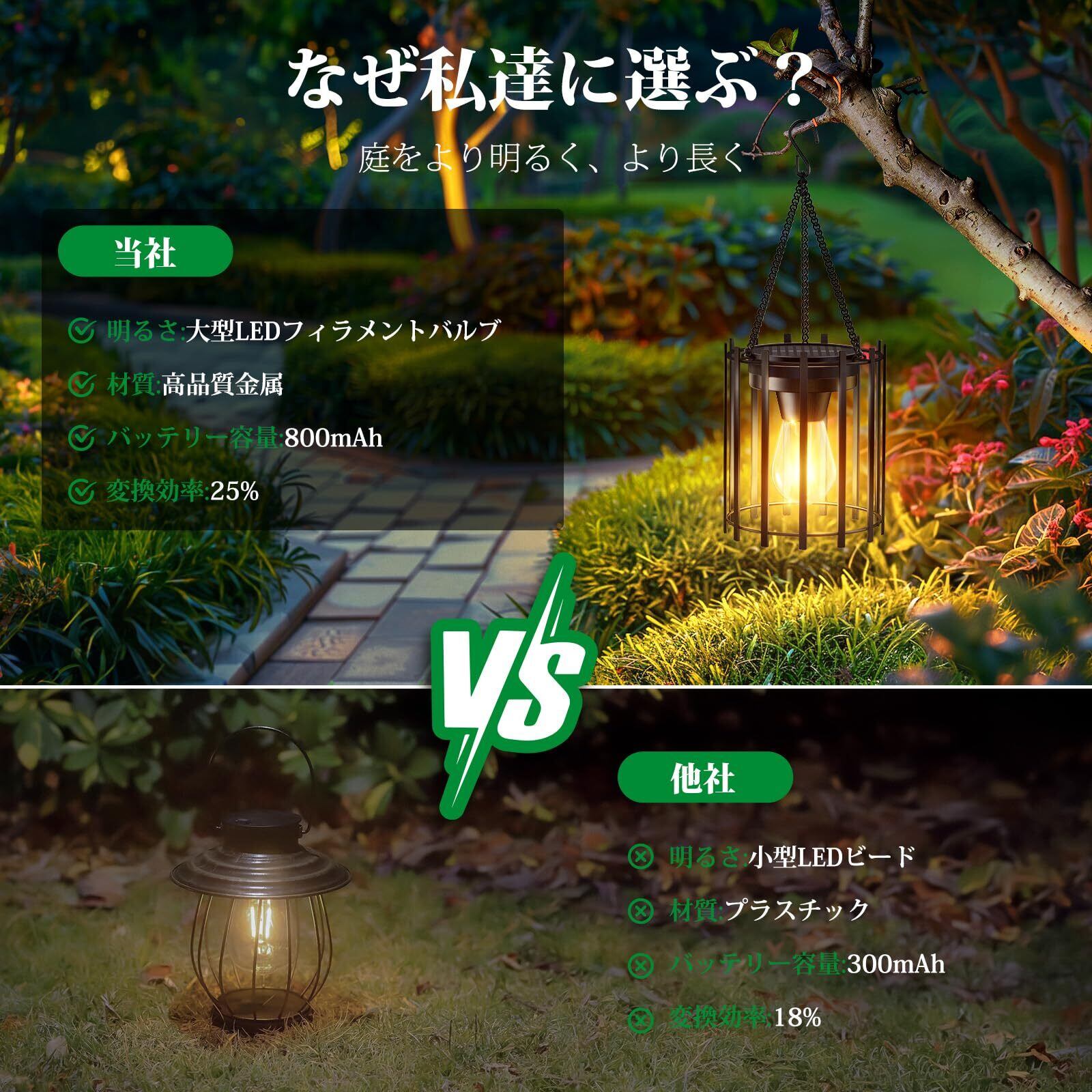 【他社を凌駕する性能比較】当社製品は大型LEDフィラメント(800mAh/25%効率)と高級金属ボディを採用し、従来の小型LED(300mAh/18%効率)やプラスチック製ランタンとは一線を画します。明るさは約2倍、バッテリー持続時間は最大3倍に向上。庭の装飾から防災用照明まで、多様なシーンで信頼性の高い性能を発揮し、長期的なコストパフォーマンスも実証済みです