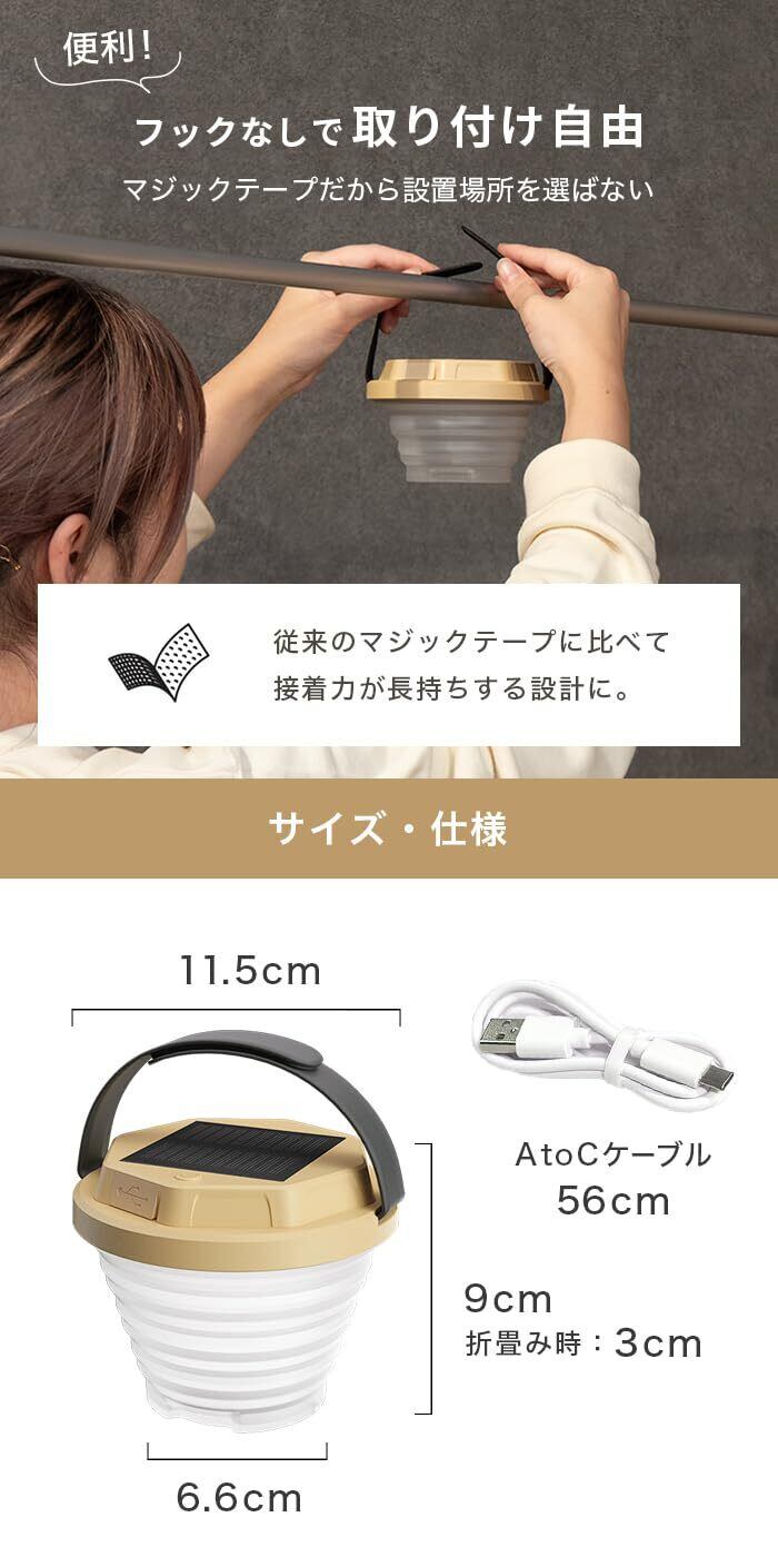 吊り下げもできるシンプル&ナチュラルデザイン:マジックテープバンド付きで簡単に吊り下げ可能。ナチュラルカラーでシンプルなデザインなので室内利用もOK、暖色系(3000K)の優しい光が空間をやさしく照らします。
