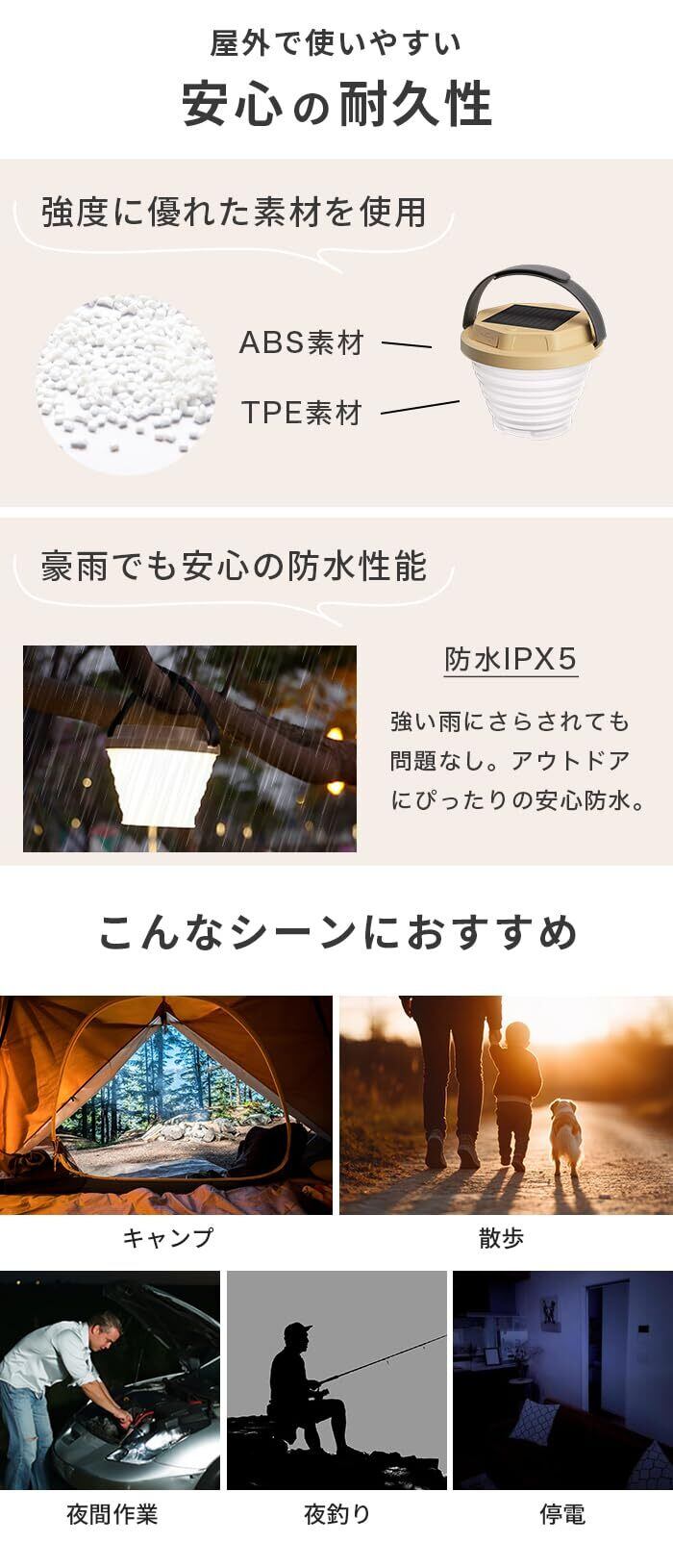 防水仕様でアウトドアにも安心:IPX5相当の防水性能を備えており、雨や水しぶきにも耐えられます。キャンプや防災用品として、悪天候時でも安心してご使用いただけます。