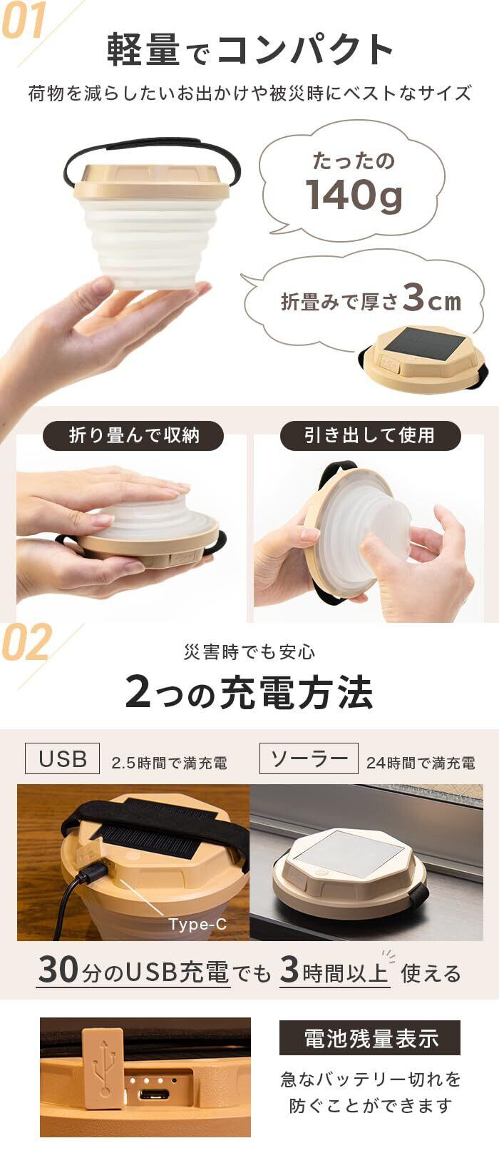 HAPPYJOINT オルディア LEDランタン ソーラー 充電式 防水 Type-C 調光 折りたたみ 140g