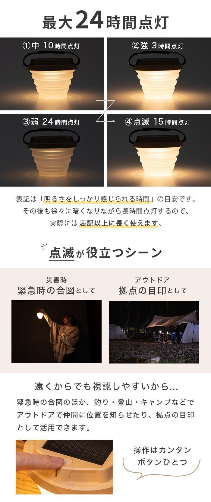 もしもの備えにも!コンパクト&高性能なソーラーランタン「Ordia(オルディア)」。USBとソーラーの2つの方法で充電が可能で、最大24時間の長時間点灯も。防水IPX5仕様で、雨の日でも安心して使用できます。明るさは3段階調光ができ点滅モードも選べで、キャンプ利用はもちろん非常時の夜間避難や非常灯にもぴったりです。折りたたみ仕様で非常に軽いので携帯性も抜群です。インテリアにも馴染むボディーカラーと優しい暖色系の光、日常的に使いやすいLEDランタンです。