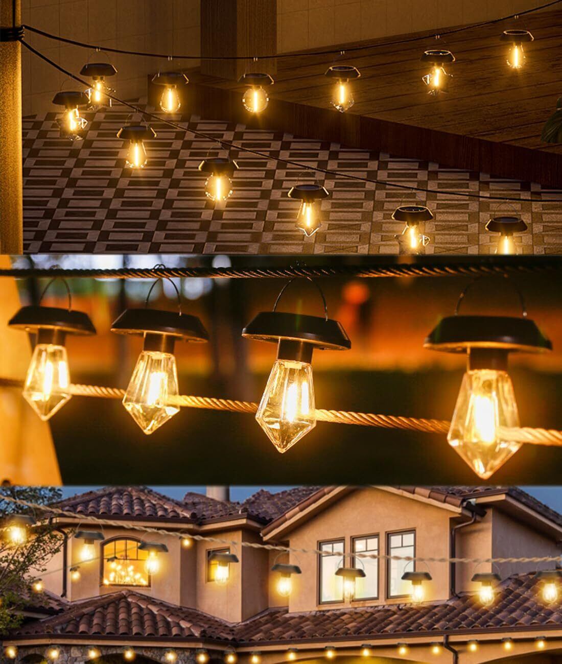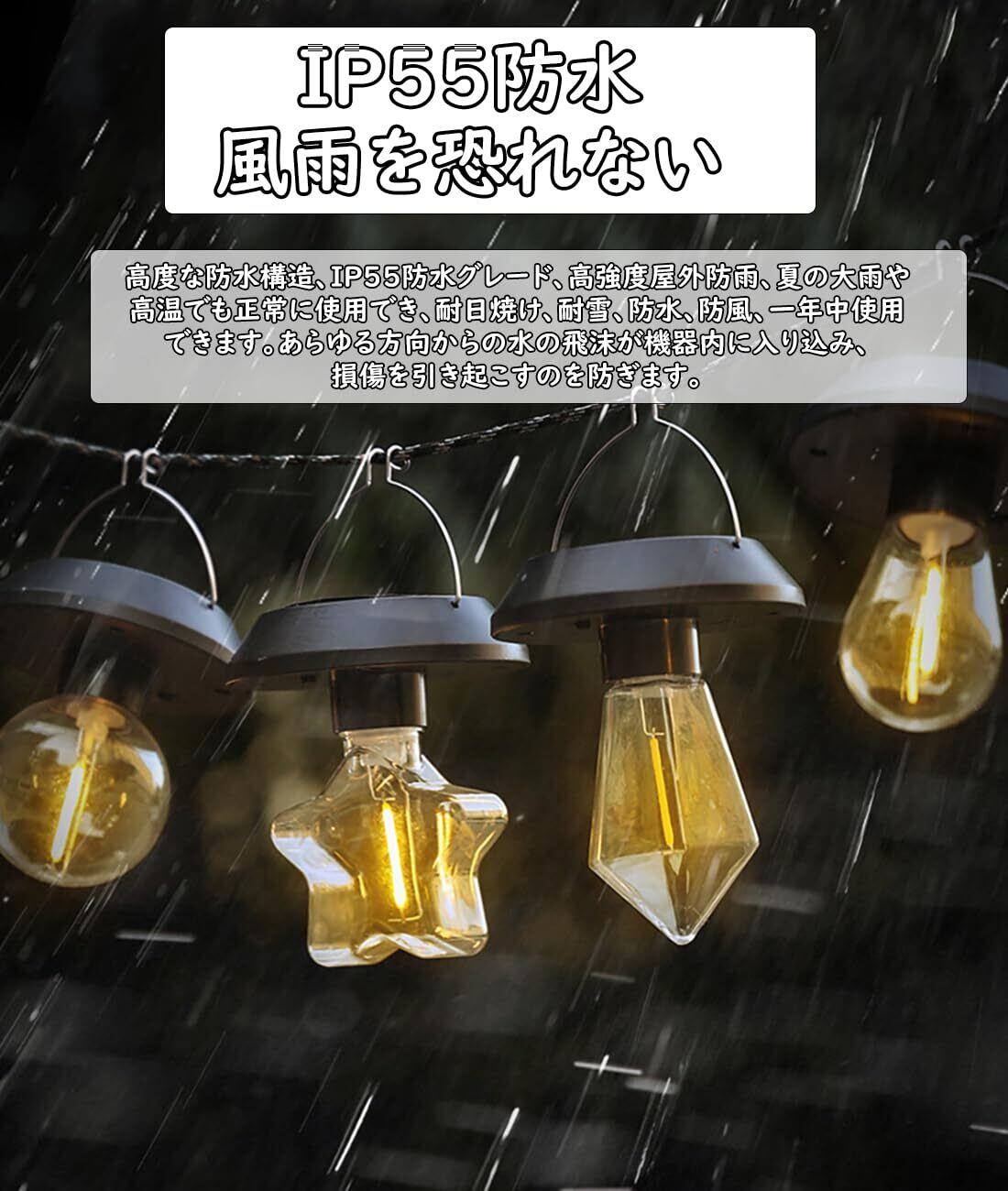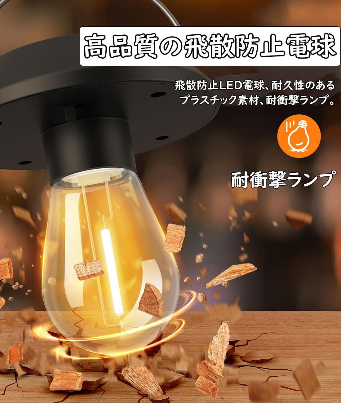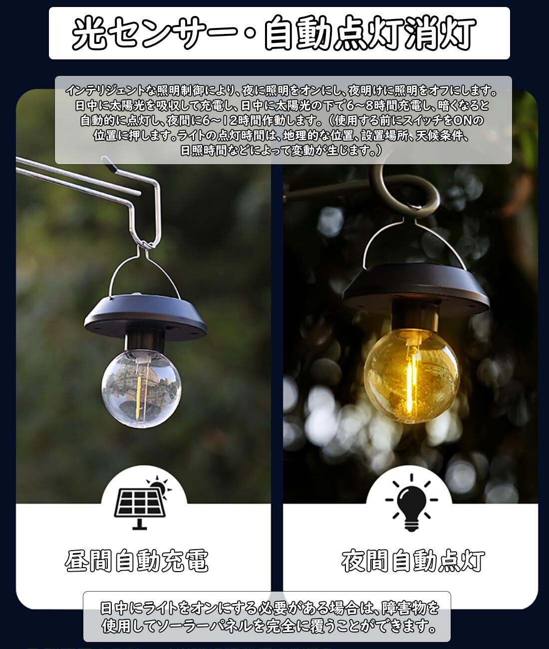 【高品質の飛散防止電球、取り付けと使用が簡単】飛散防止LED電球、耐久性のあるプラスチック素材、耐衝撃ランプ。ソーラーライトを受け取ったら、スイッチをオンにして、直射日光が当たる場所に吊るし、太陽光を十分に吸収して充電します。充電が完了したら、暗くなって照明や装飾が必要な場所に自由に移動できます。フル充電後は配線なしですぐにご使用いただけます。使いやすく、人間による管理は必要ありません。夜には自動的に点灯し、夜明けに充電されます。