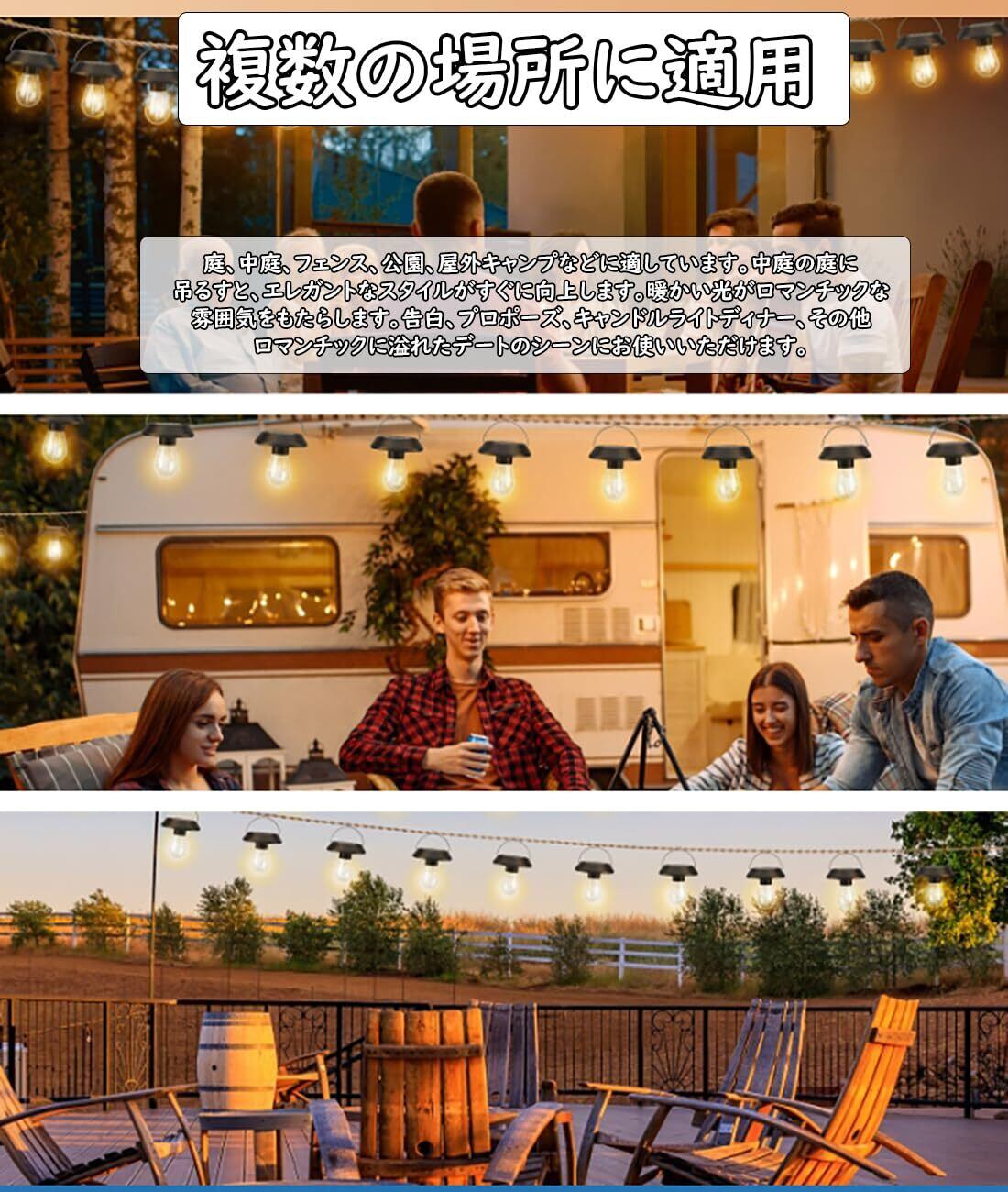 【吊り下げ使用、複数の場所に適用】ワイヤレスで便利、吊り下げて使用でき、ワイヤレス接続は不要、持ち運びフック、金属製のフックが付属し、どんなスペースでも使用できます。取り付け不要の吊り下げフックが付属しており、ベースがない空間でも照らすことができます。庭、中庭、フェンス、公園、屋外キャンプなどに適しています。中庭の庭に吊るすと、エレガントなスタイルがすぐに向上します。暖かい光がロマンチックな雰囲気をもたらします。告白、プロポーズ、キャンドルライトディナー、その他ロマンチックに溢れたデートのシーンにお使いいただけます。