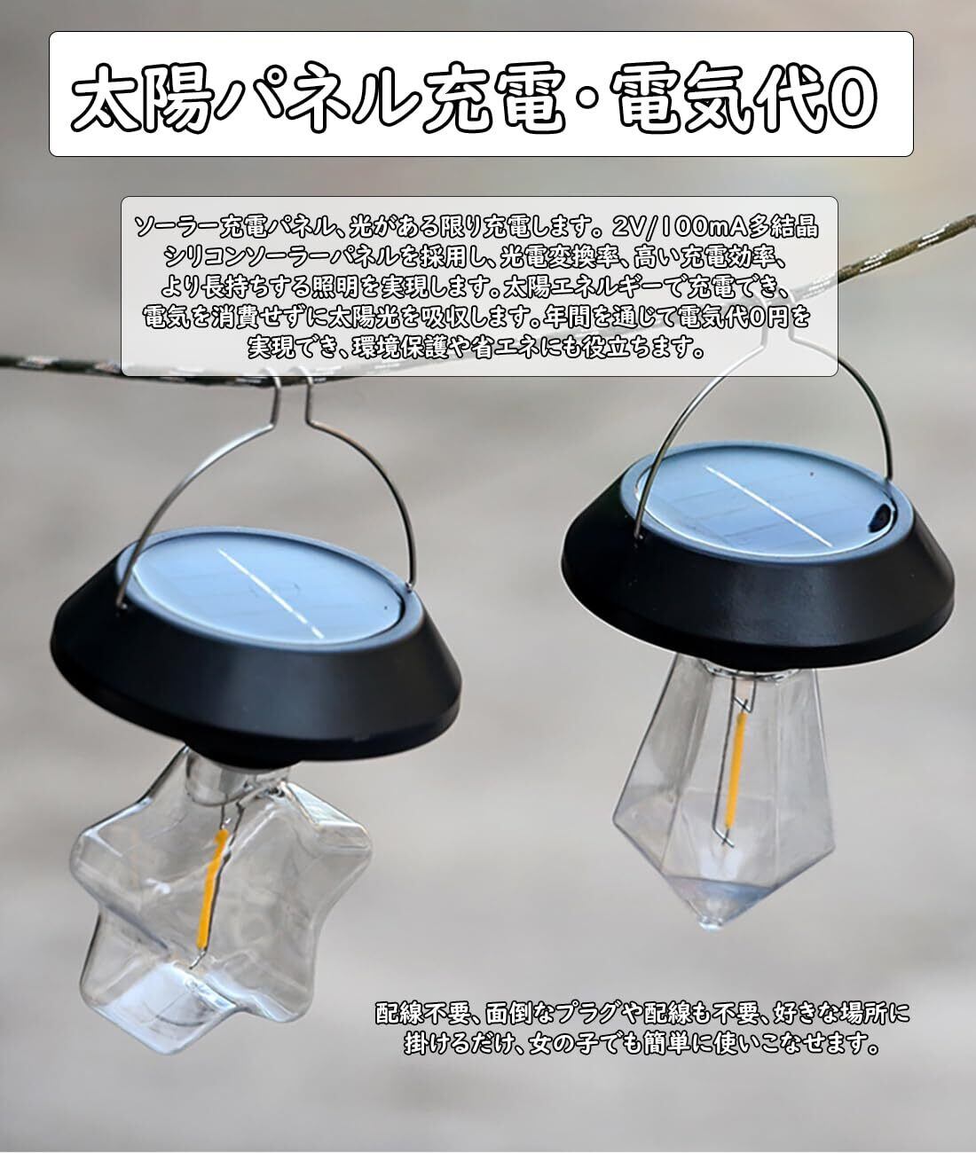 【ソーラー充電・電気代0】ソーラー充電パネル、光がある限り充電します。 2V/100mA 多結晶シリコンソーラーパネルを採用し、光電変換率、高い充電効率、より長持ちする照明を実現します。太陽エネルギーで充電でき、電気を消費せずに太陽光を吸収します。年間を通じて電気代0円を実現でき、環境保護や省エネにも役立ちます。配線不要、面倒なプラグや配線も不要、好きな場所に掛けるだけ、女の子でも簡単に使いこなせます。
