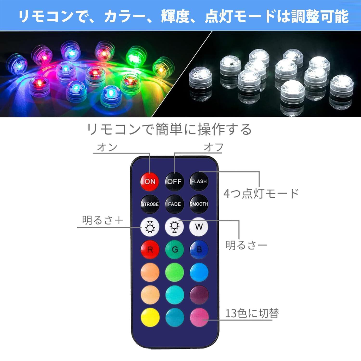 ご注意:本製品は維凱電子だけ正規品です。リモコン操作:リモコンが付属するので、カラー、輝度、スピードなどは調整可能です。1ライトは1個超高輝度SMD5050 RGB LEDで作されて、全13色に切替え、水中に入れて非常に綺麗なマルチカラーのライトが輝いてます。