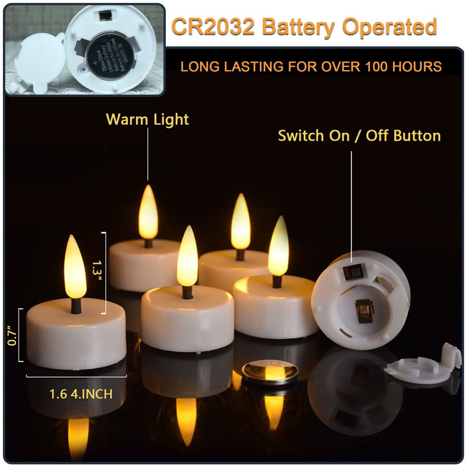 タイミングプログラム:タイマー機能付き(6時間オン、24時間ごとに18時間オフ)、毎日オン/オフする手間を省きます。LEDティーライトにはバッテリーが取り付けられており、バッテリーは100時間以上の点灯時間があり、下部のタブで簡単に交換できます。