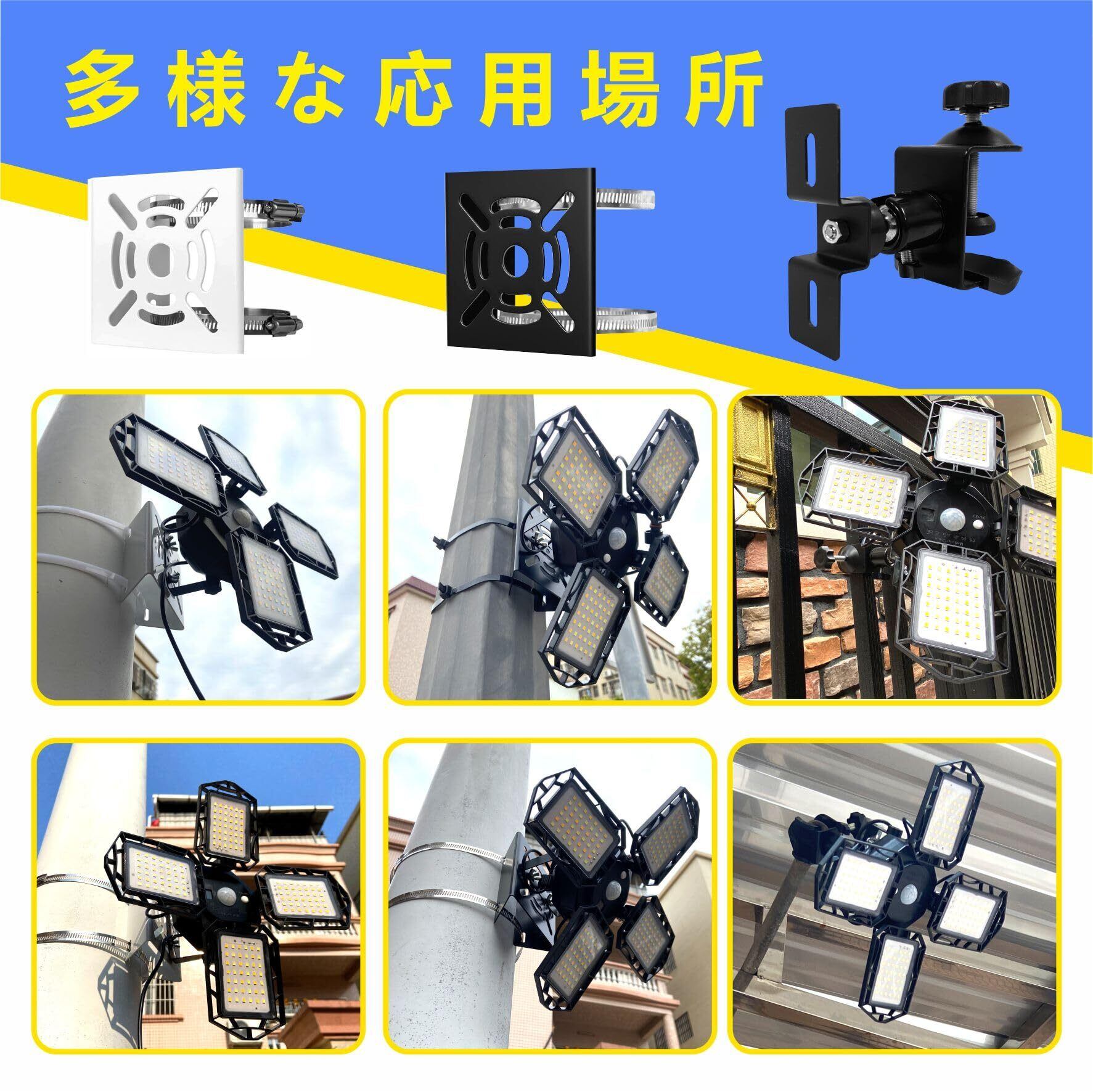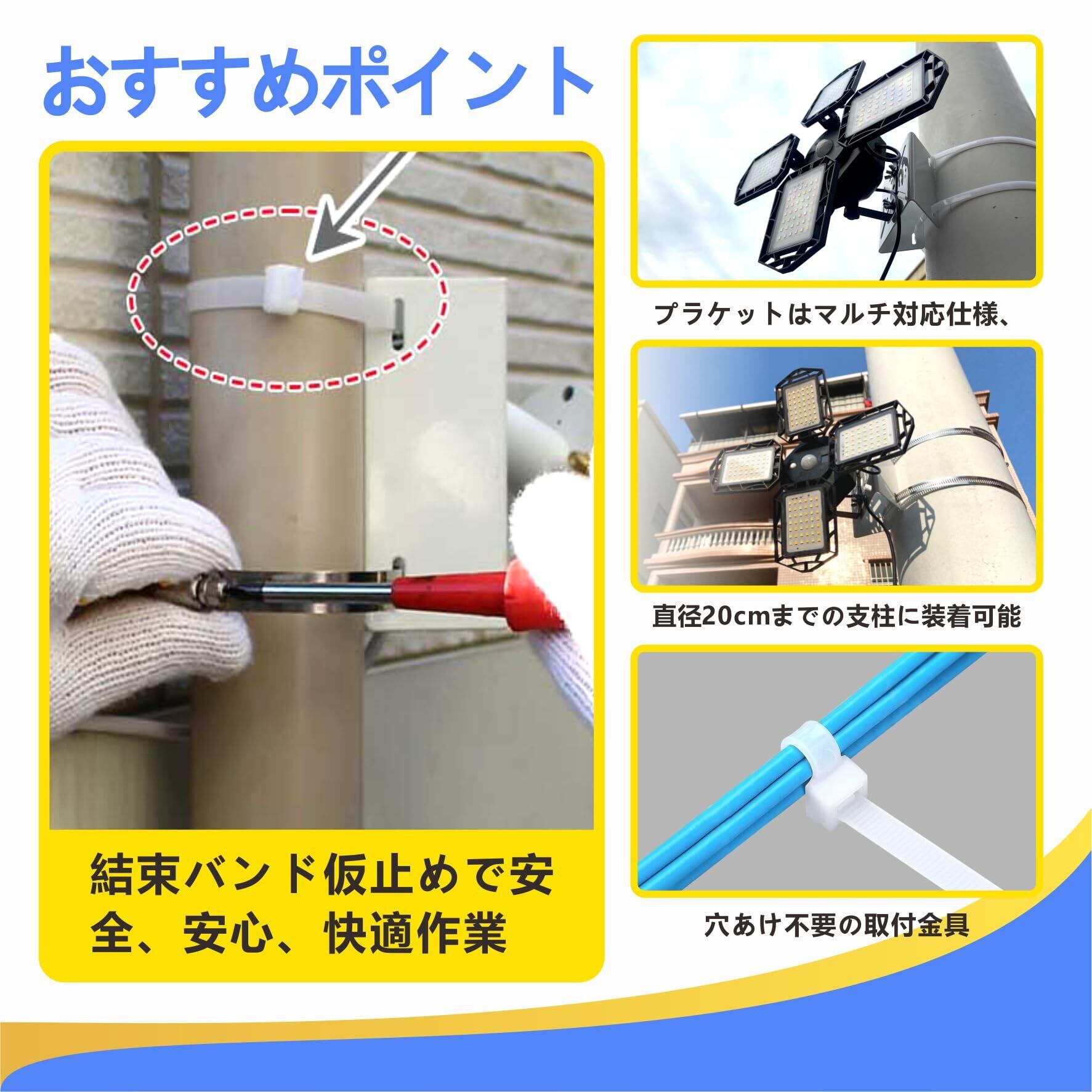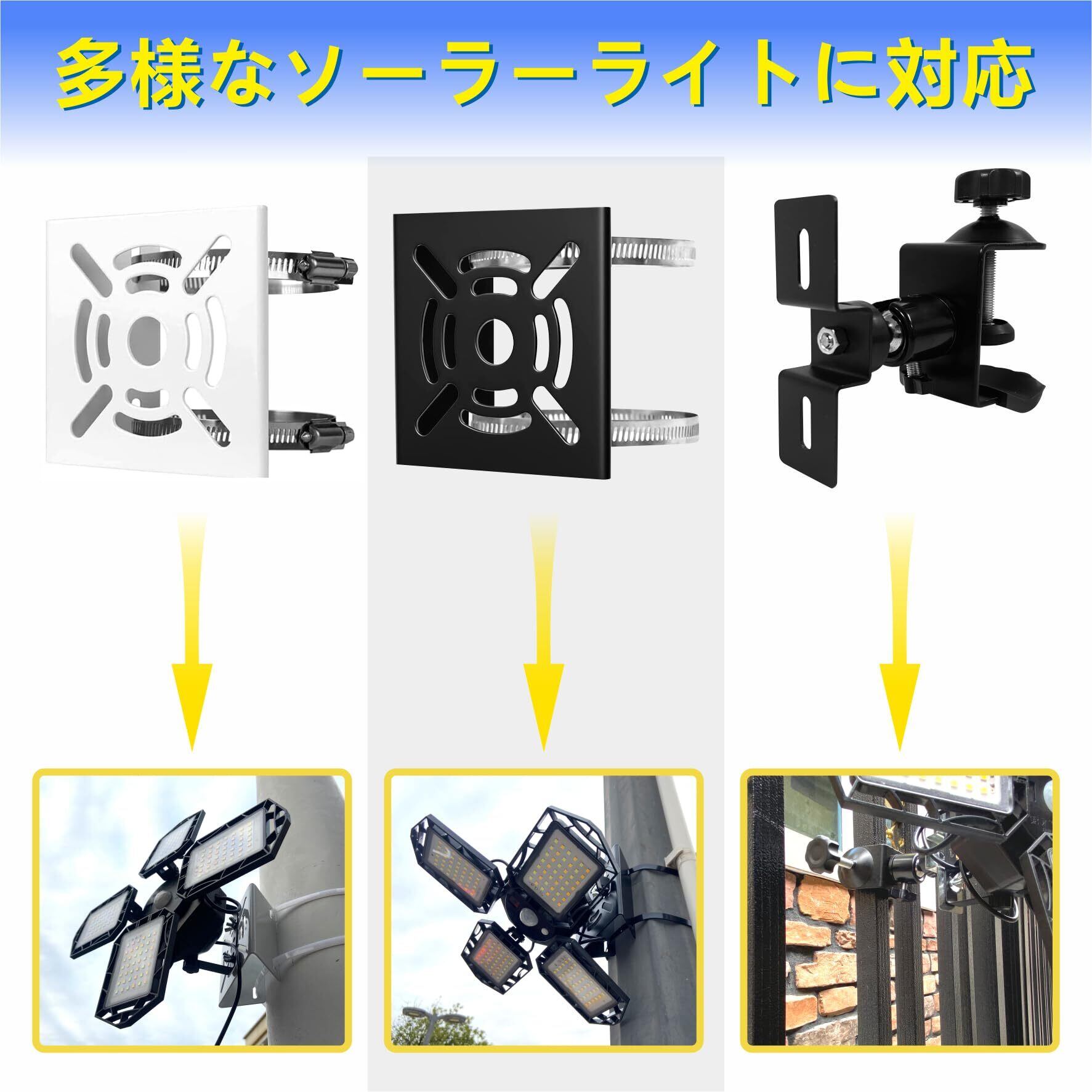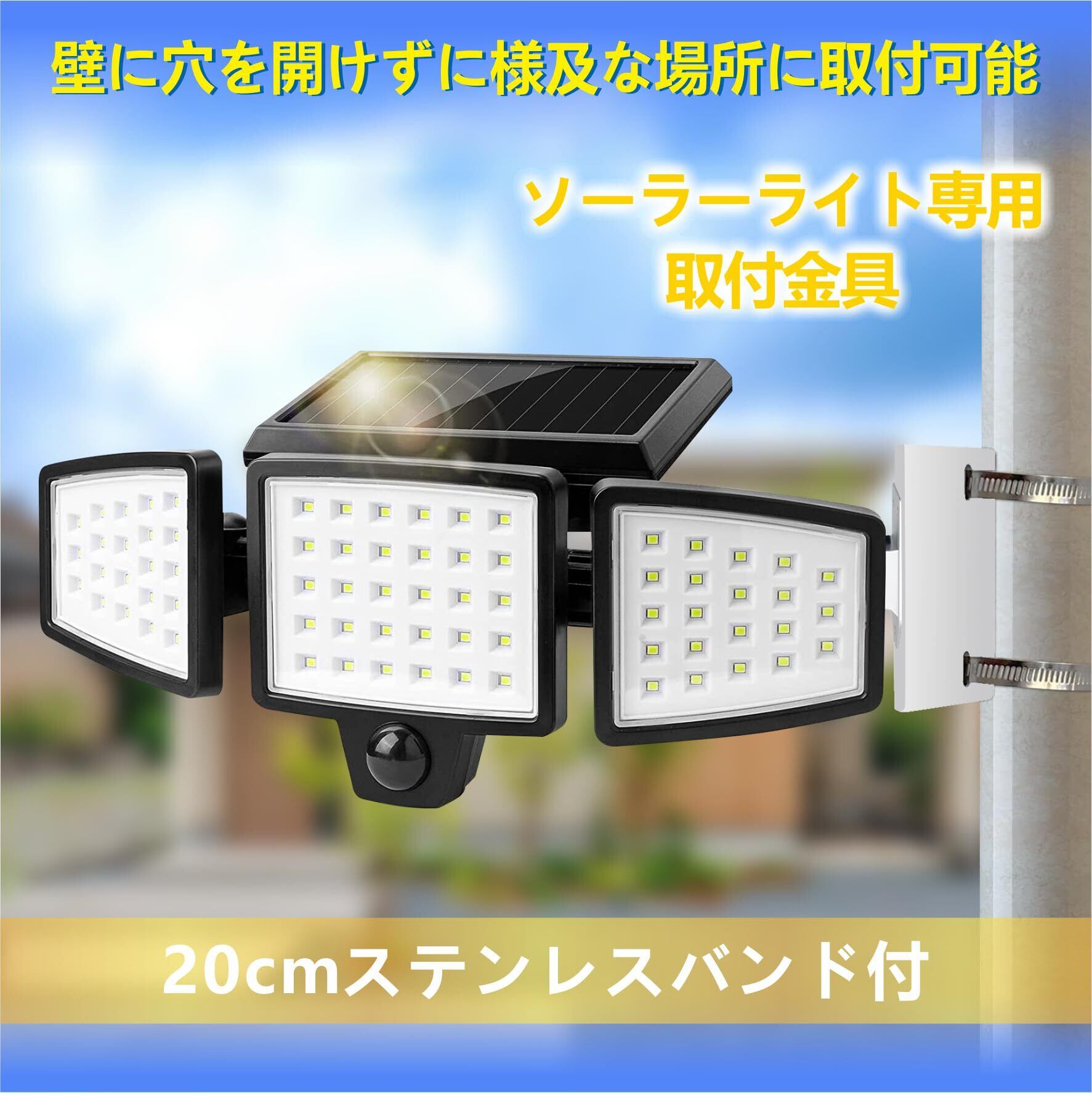 【使用場所が広い】こちらのソーラーライト取り付け用ブラケットは、付属のステンレスバンドで円柱・角柱などの支柱にソーラーライトをしっかり固定する設計となっております。ポールやコンクリート柱、木柱は勿論、格子や金網フェンスなど、ある程度の強度がある場所であれば「どこにでも」、「誰でも」、「簡単に」取り付け可能です!ご自宅の防犯、店舗での万引き防止、駐車場、店舗、ガレージ、オフィス、展示場、ホテル、町内、旅館、民泊などの様々な場面で活躍します。
