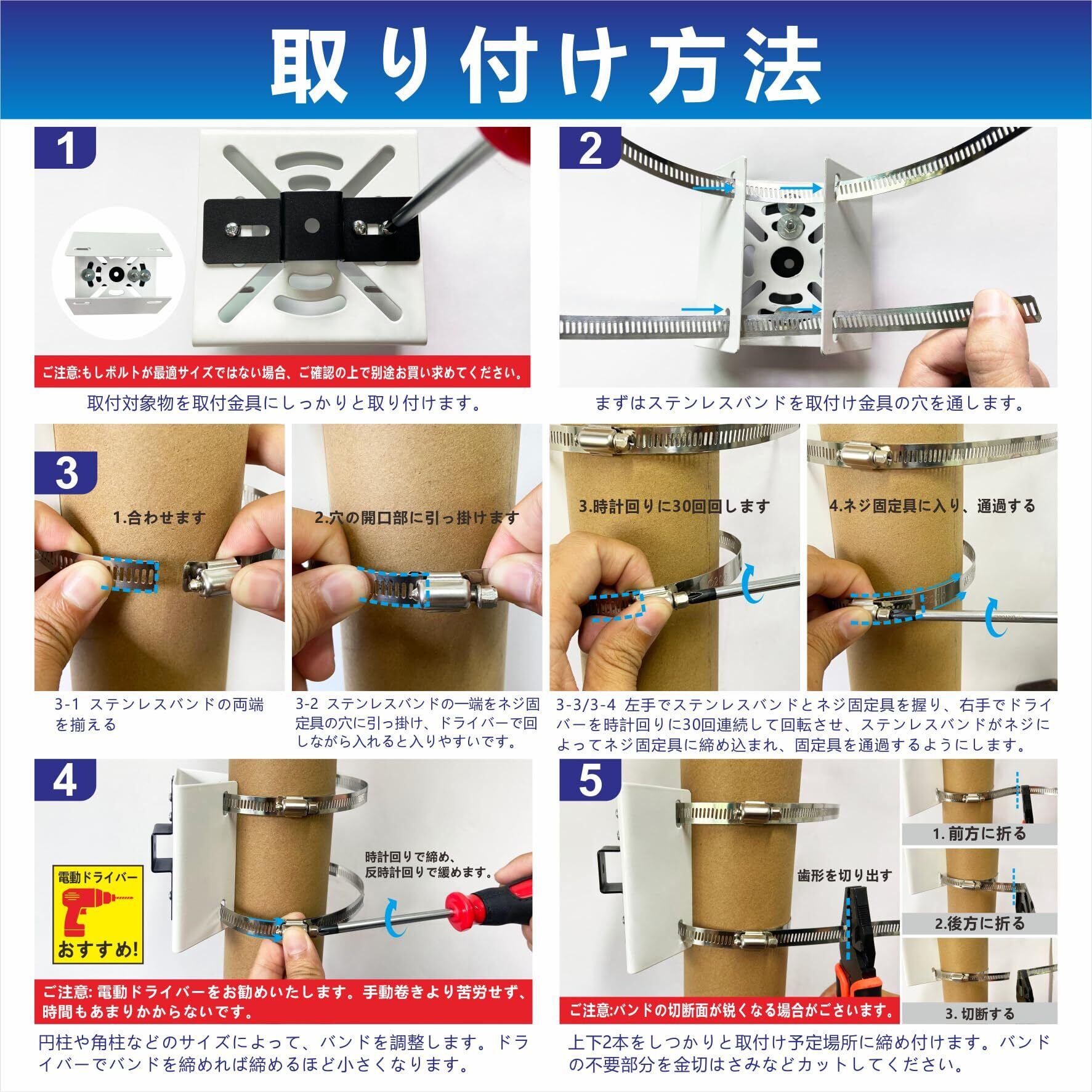 【穴あけ不要で簡単取付】センサーライト、カメラの固定に穴あけは必要ありません。防犯カメラの取り付けというと、一般的には壁に穴を開け、穴を開けた部分から水が浸入しないように防水処理を施すなど、大がかりな工事になってしまいます。この取付金具は手軽に、そして確実に防犯カメラ取付を行えるように開発された取り付け金具のセットです。 穴開け不要で取り付け、ドライバー1本で取付完了。※取り付けの際は電動ドライバーの使用を推奨しておりますが、普通のドライバーも使用が可能でございます。