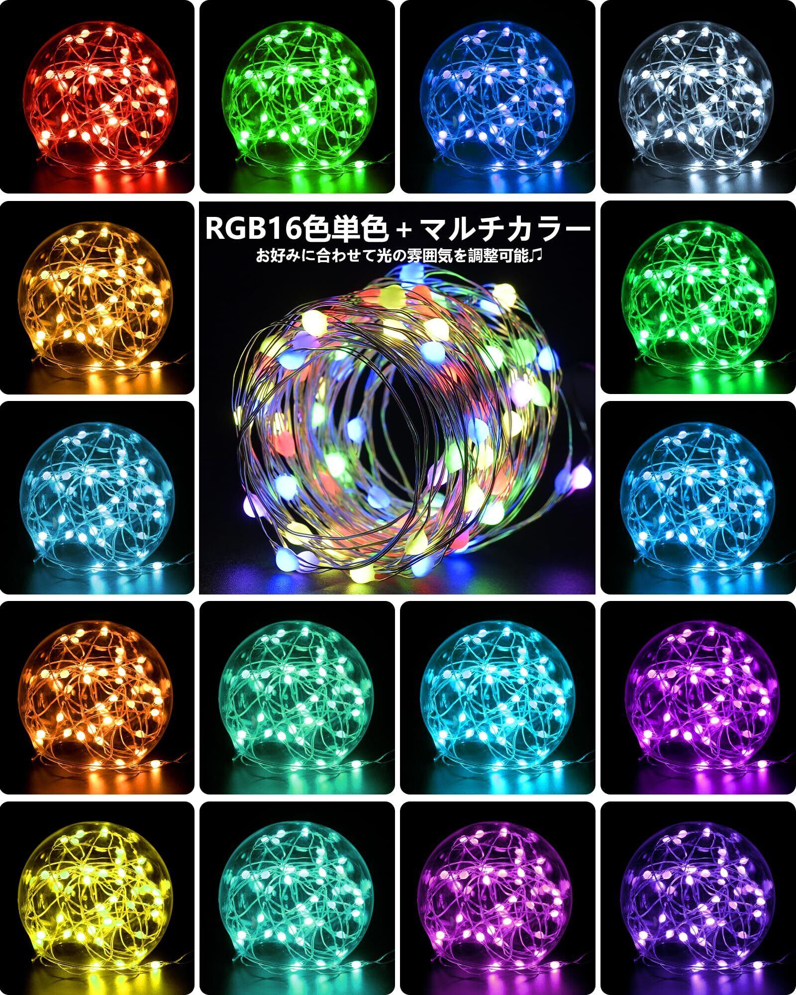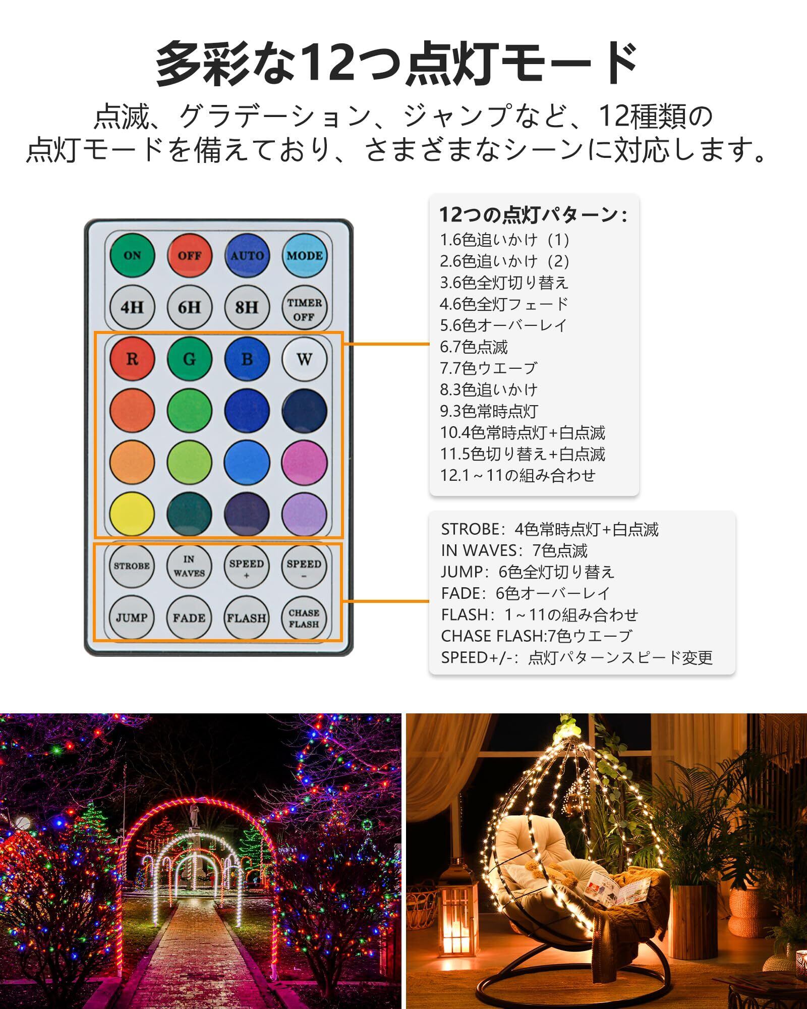 ✨【マルチカラーRGB16色・12つ点灯モード】このクリスマス イルミネーションライトはウォームホワイト、ブルー、クールホワイト、グリーンなど含め、16種類の異なるRGBカラーを備えており、カラフルな光でお好みに合わせて光の雰囲気を調整できます。また通常のLEDイルミネーションがよくあるの点滅、グラデーション、ジャンプ、落ち着いてる常時点灯など点灯パータンもあるの一方、3色~7色の組み合わせ点灯パータンもあり、合計12種類の多彩な点灯モードを提供します。点灯すると非常に鮮やかでキレイで、さまざまなシーンに対応するLED ストリングライトです。