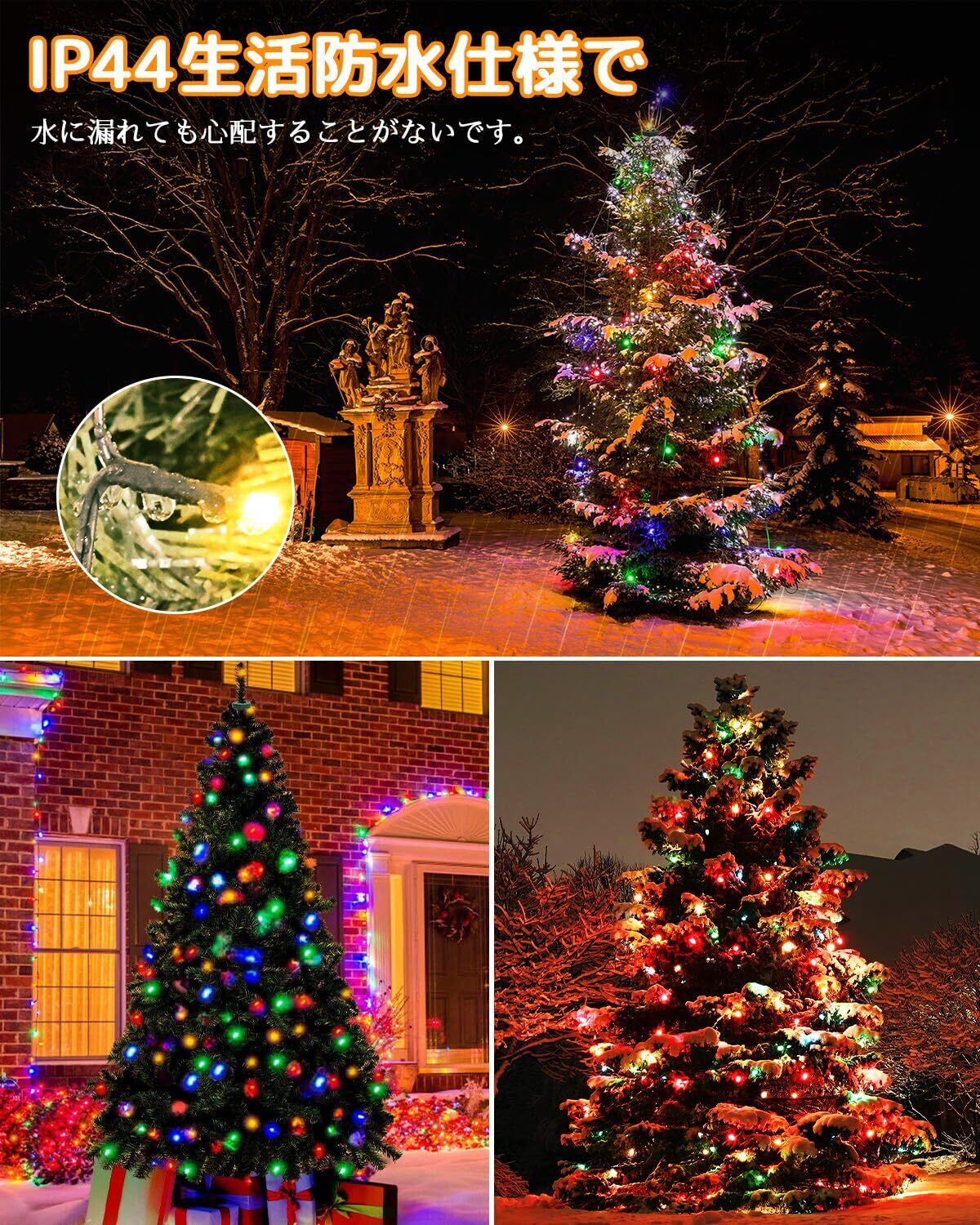 【防水・取付簡単】このLEDイルミネーションライトは、IP44生活防水仕様で、雨や水しぶきから守られています。屋外でも安心して使用できます。付属の30V 0.2A給電器にコンセントを差し込むだけで、明るく美しいLEDライトが点灯します。消費電力は従来の電球に比べて低く、柔らかく幻想的な光をお楽しみいただけます。ご注意:付属の給電器(30V 0.2A)は防水仕様ではありませんが、低電圧設計で過熱の心配がなく、安全性が確保されています。