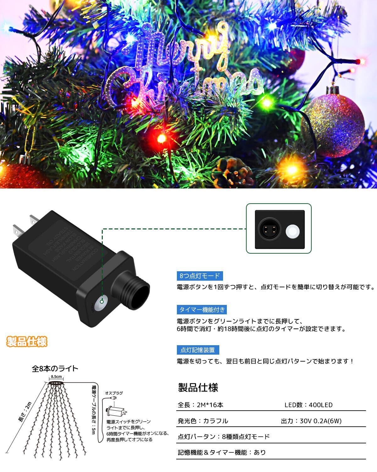【2025最新】クリスマス LED イルミネーションライト クリスマスツリーライト 2M 16本 400球 イルミネーションライト 屋外 ライト クリスマスツリー飾り LED イルミネーション メモリー機能 8種点灯モード タイマー機能 デコレーション ストリングライト クリスマス/新年/家庭 クリスマスツリー用 電飾 装飾