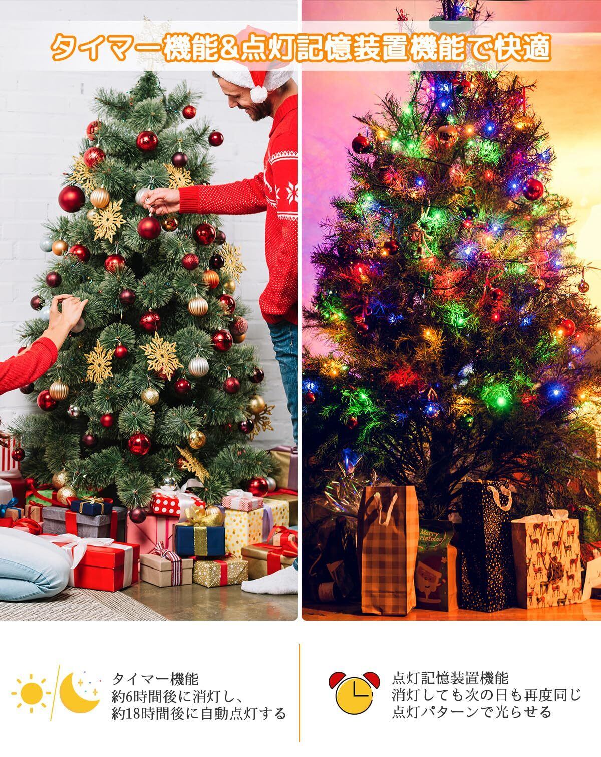 【タイマー機能付きクリスマスツリーライト】このクリスマスツリー用LEDイルミネーションライトには、便利なタイマー機能が搭載されています。タイマー機能をオンにすると、ライトは約6時間点灯した後、約18時間自動的に消灯します。毎日決まった時間に点灯するので、手間なくイルミネーションを楽しめます。省エネ設計で、長時間の使用にも適しています。華やかなデザインのライトは、ショッピングモールやテーマパークなどの大規模な飾りつけにもぴったり。明るさも調整されており、どんなスタイルにも合わせやすいのが特徴です。また、スタイリッシュなパッケージデザインなので、ギフトとしてもおすすめです。