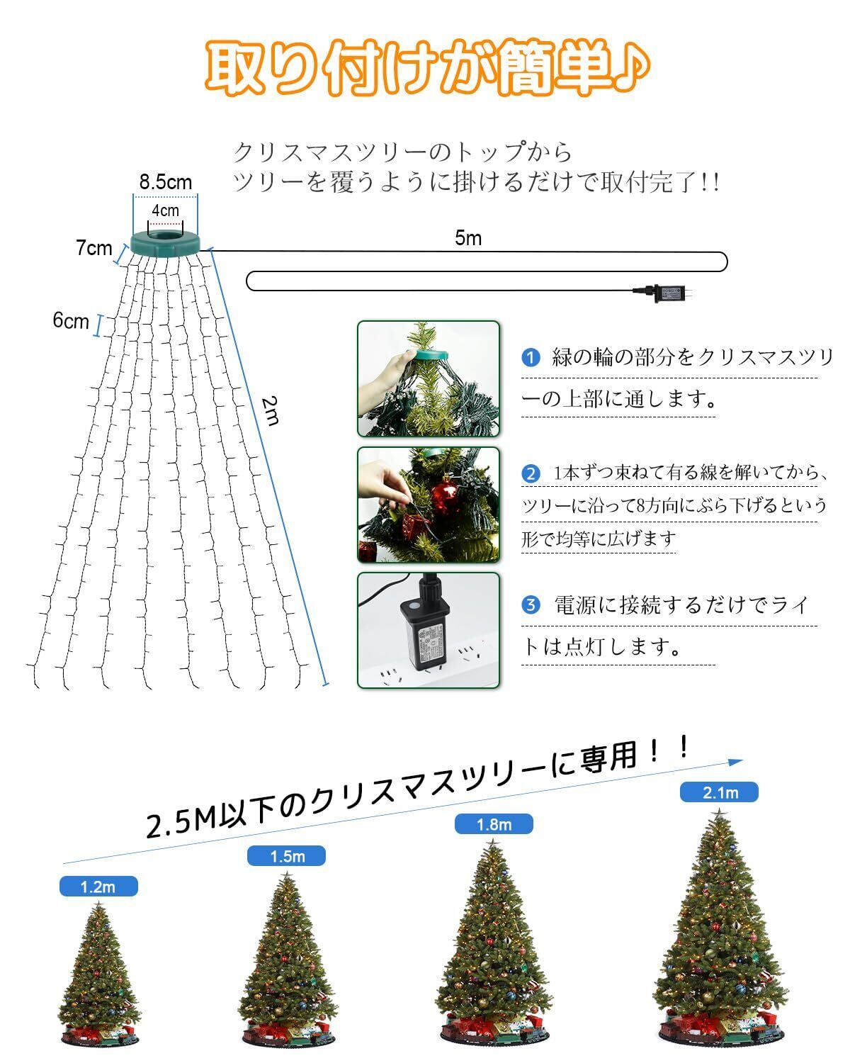 【取付楽々で設置の手間が省け】16本ドレープライトライトの上部が均等に輪っかに固定しているため、写真のようにクリスマスツリーの上部から直径10cmの輪っかを通して後は吊り下げるだけで電球取り付け完了。16本のライトを広げるだけでツリーをバランスよく装飾できます。そして、プラグをコンセントに挿すだけでライトが点灯します!明るさやライトの大きさも丁度良く、クリスマスツリーにピッタリです!お部屋にクリスマスツリーとイルミネーションライトを飾れば、季節感あふれる空間を楽しむことができます。