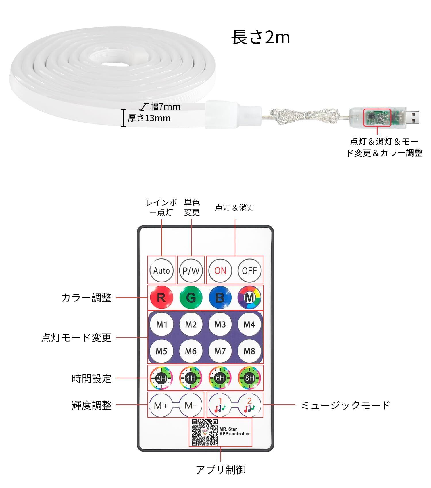 流れる ledテープライト usb 5v IP67防水 led ネオンチューブ リモコン付き テープ照明 取付簡単 間接照明 店の飾り テープライト 2m 虹色