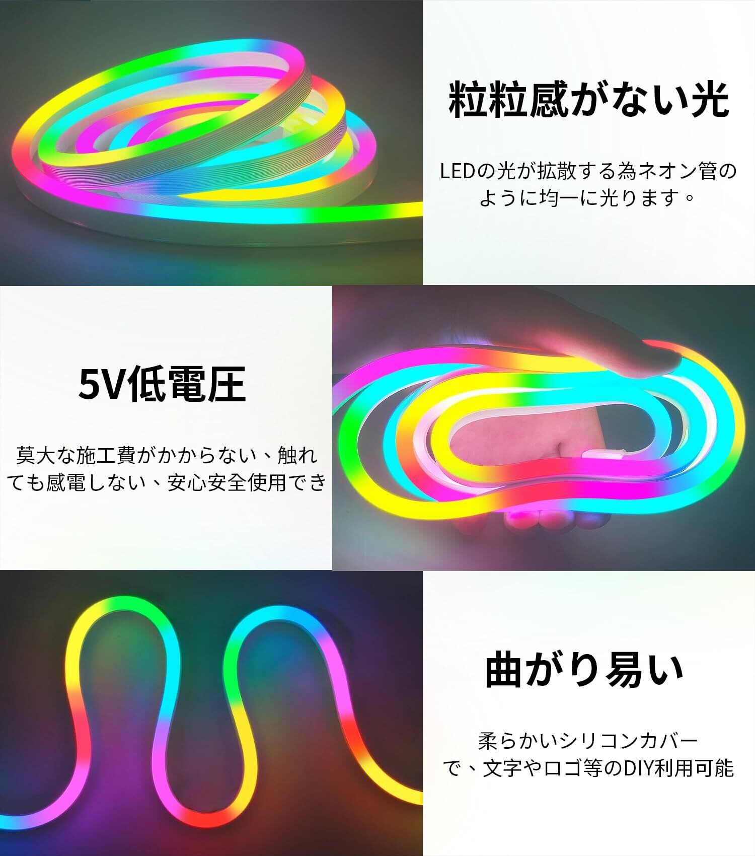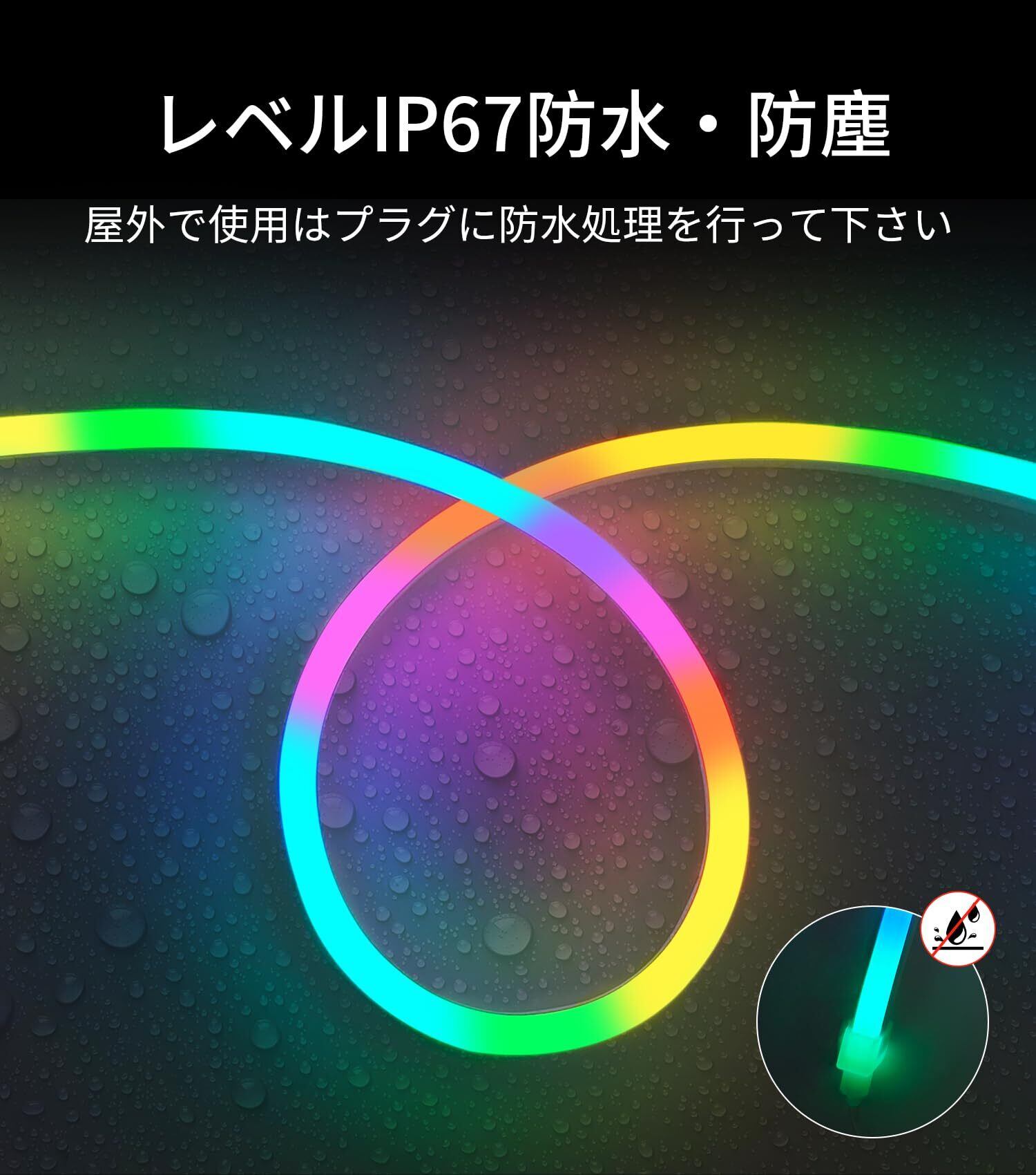 【IP67防水・曲げやすい】このledテープライトの外側はシリコンチューブで保護されており、IP67等級防水・防塵性能を備えており、屋外でも安心して使用できます。また、柔軟性にも優れているため、お好みの形状にDIYしやすいのも特徴です。