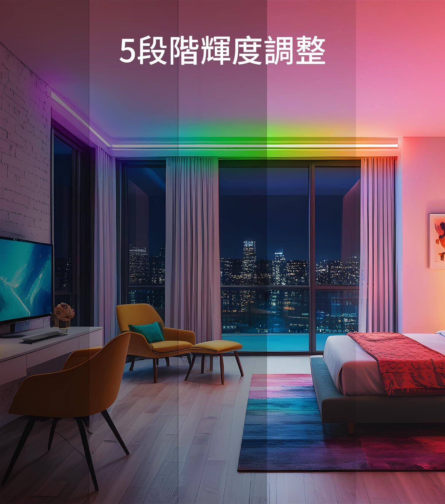 【RGBIC・調光調色】このledテープライトはRGBICチップを搭載しており、1,600万色の調色と無段階の調光が可能です。また、同時に複数色を発光できる仕様で、色が流れるような多彩な点灯モードをお楽しみいただけます。