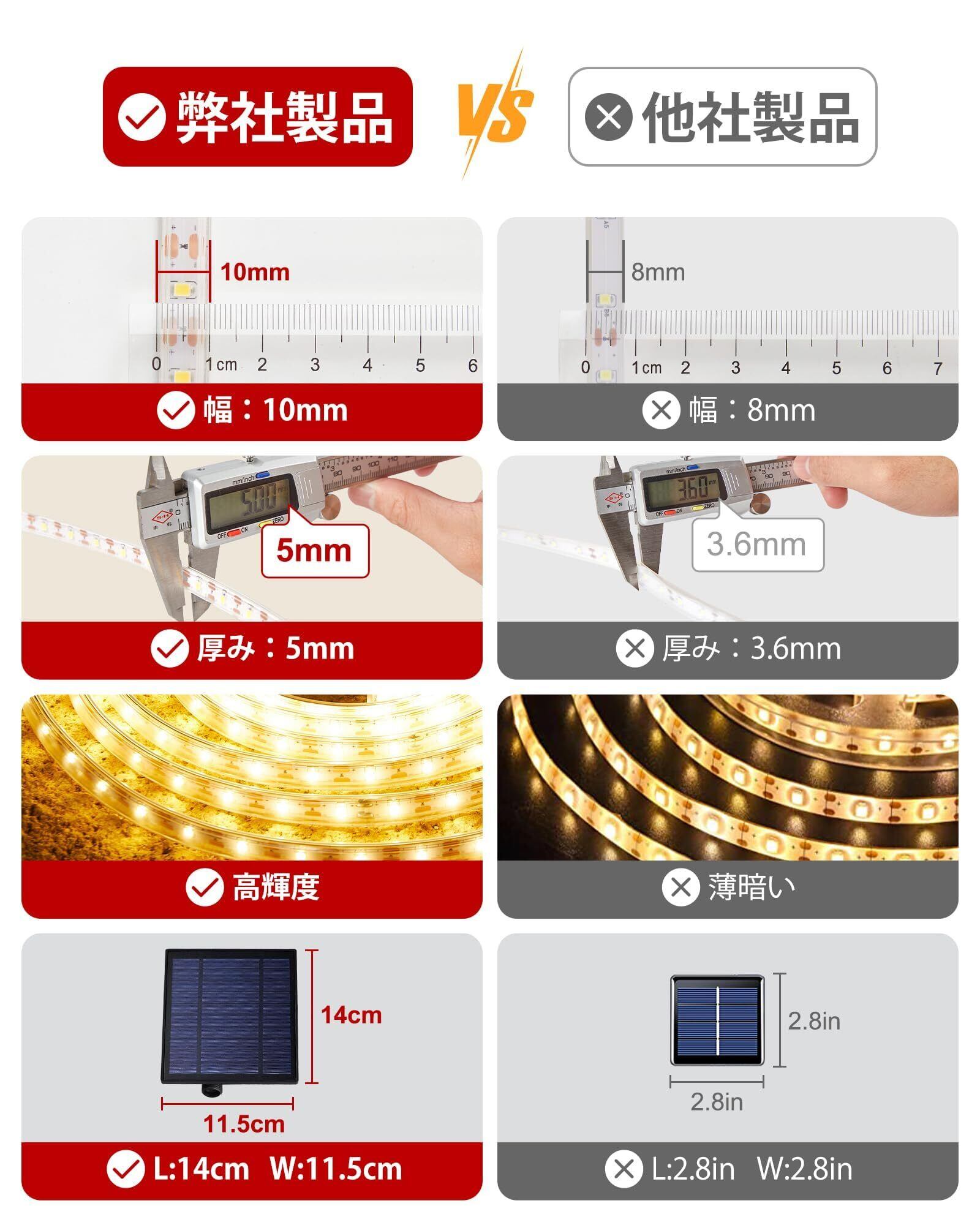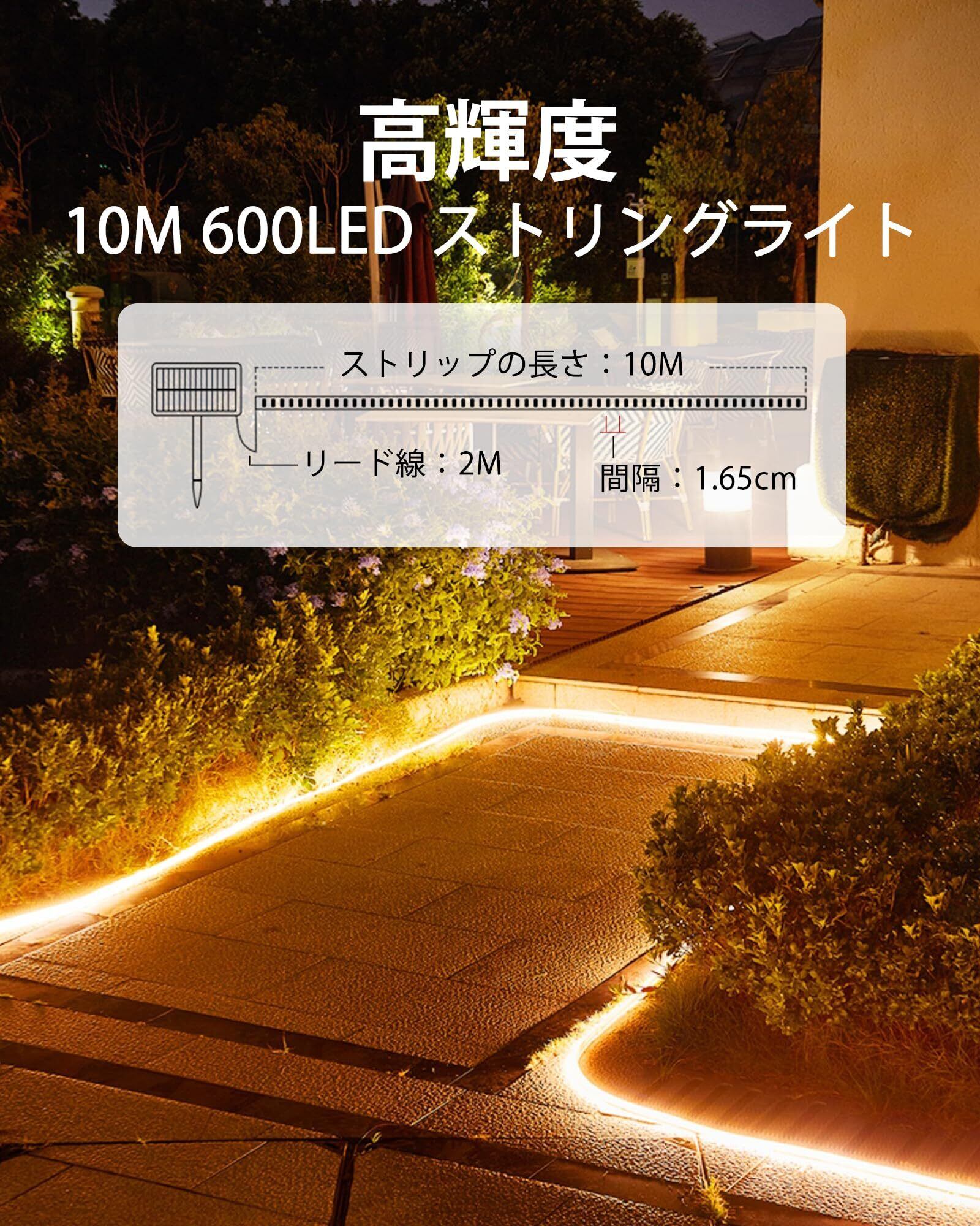 アップグレードされたソーラー テープライト:このLEDテープライト10mは高輝度の600枚LEDを配置されたため、輝度はほかのledテープライトより明るくなります;屋外テープライトは幅10mm、厚さ5mmで、柔軟性が向上して折れにくいですので、長くご利用いただけます。注意してください: これらのライトは屋外の装飾に最適な柔らかな周囲光を提供しますが、広いエリアの高輝度照明に代わるものではありません。