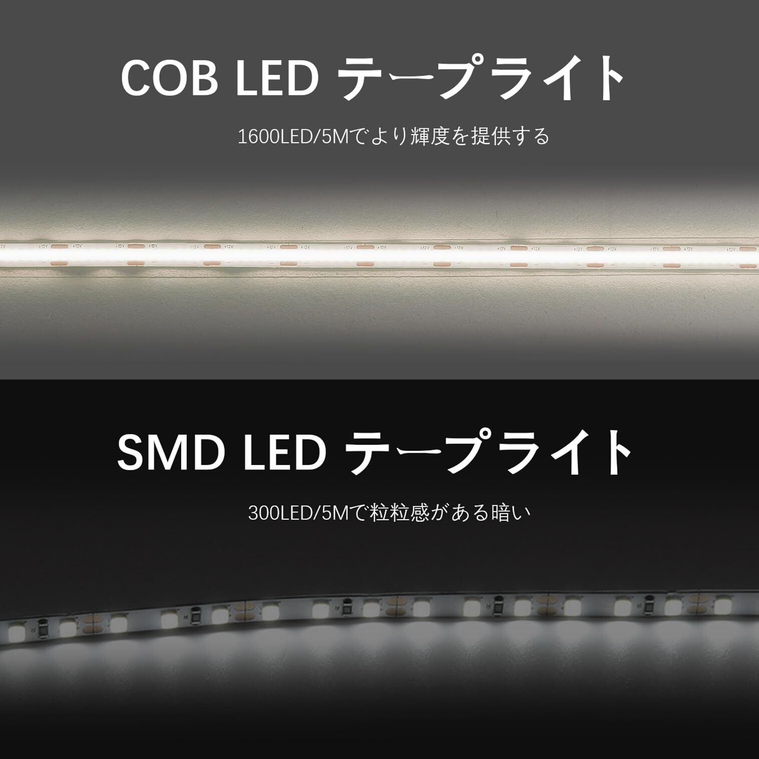 ledテープライト COB 高密度 高輝度 320LEDs/m アダプター・調光器付き 12V 5M カット可能 両面テープ設置 テープライト cob 電球色