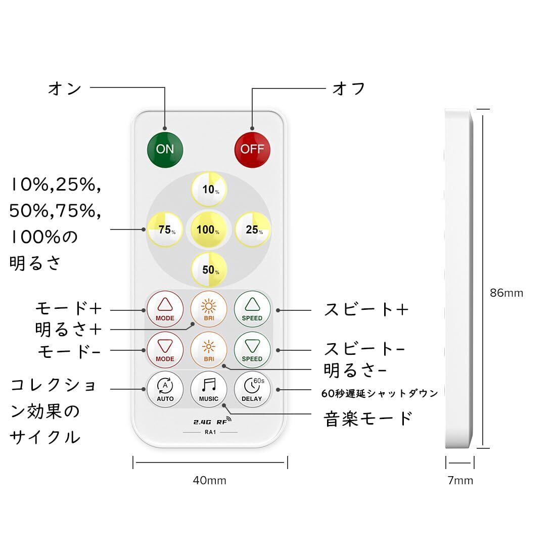 「RFリモコンは明るさを調整でき」このRFコントローラーは、小さな本体、便利な配線、シンプルでわかりやすい操作、快適なボタンを備えています。5種類の柔らかな明るさ調整モード、3種類のダイナミックモードと、2種類の音楽モードがあります。また、ダイナミックモードでは、ジャンプ、フェード、ストロボの各モードでスピード調整が可能です。コントローラは60S遅延シャットダウンの適切なシーンで使用できるため、より多様な体験をすることができます。