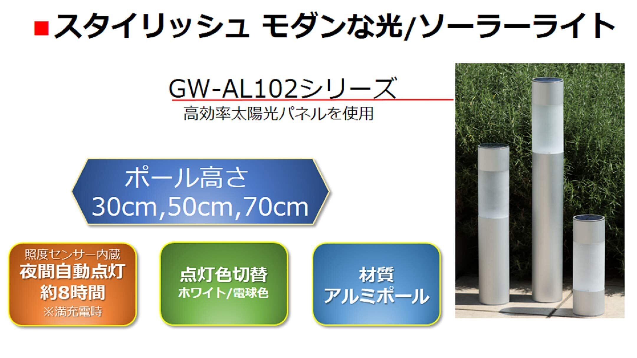 【特長】:スタイリッシュ モダンな光 /アルミポール高さ:50㎝ / 直径7㎝/ ワイト色・電球色スイッチで切替、配線・電気工事不要 GWソーラー お庭 / 玄関先/階段/デッキ/ガーデンの灯/GW-AL102-50