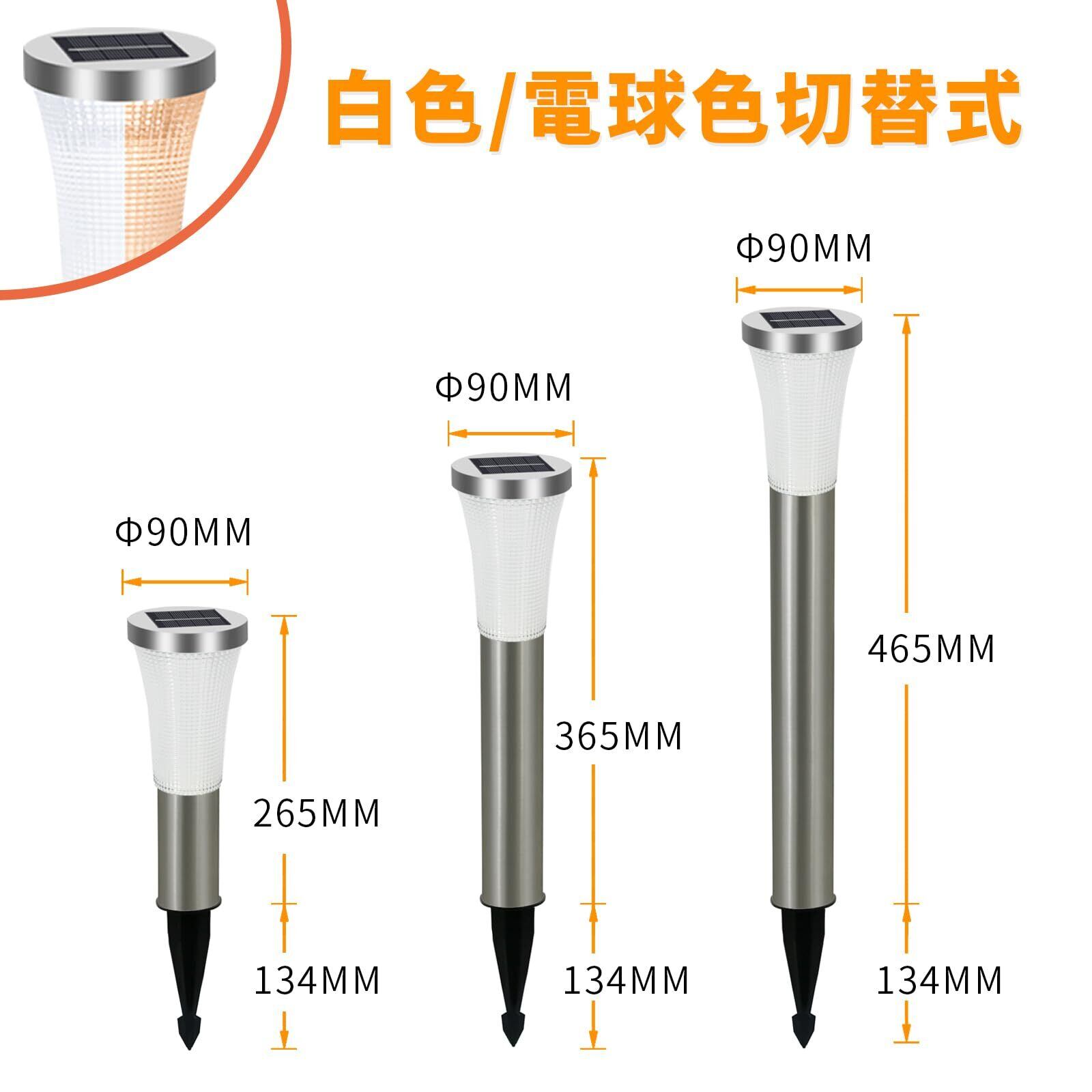 【仕様】点灯色:白色と電球色、明るさ:約10ルーメン 電源:ニッケル水素充電池単4形、点灯保持時間:フル充電後 8時間。防水性能:IPX4、商品サイズ:直径90㎜、ライト高さ:265㎜、365㎜、465㎜、差し込みアンカー部:134㎜、質量:268g, 321g ,380g