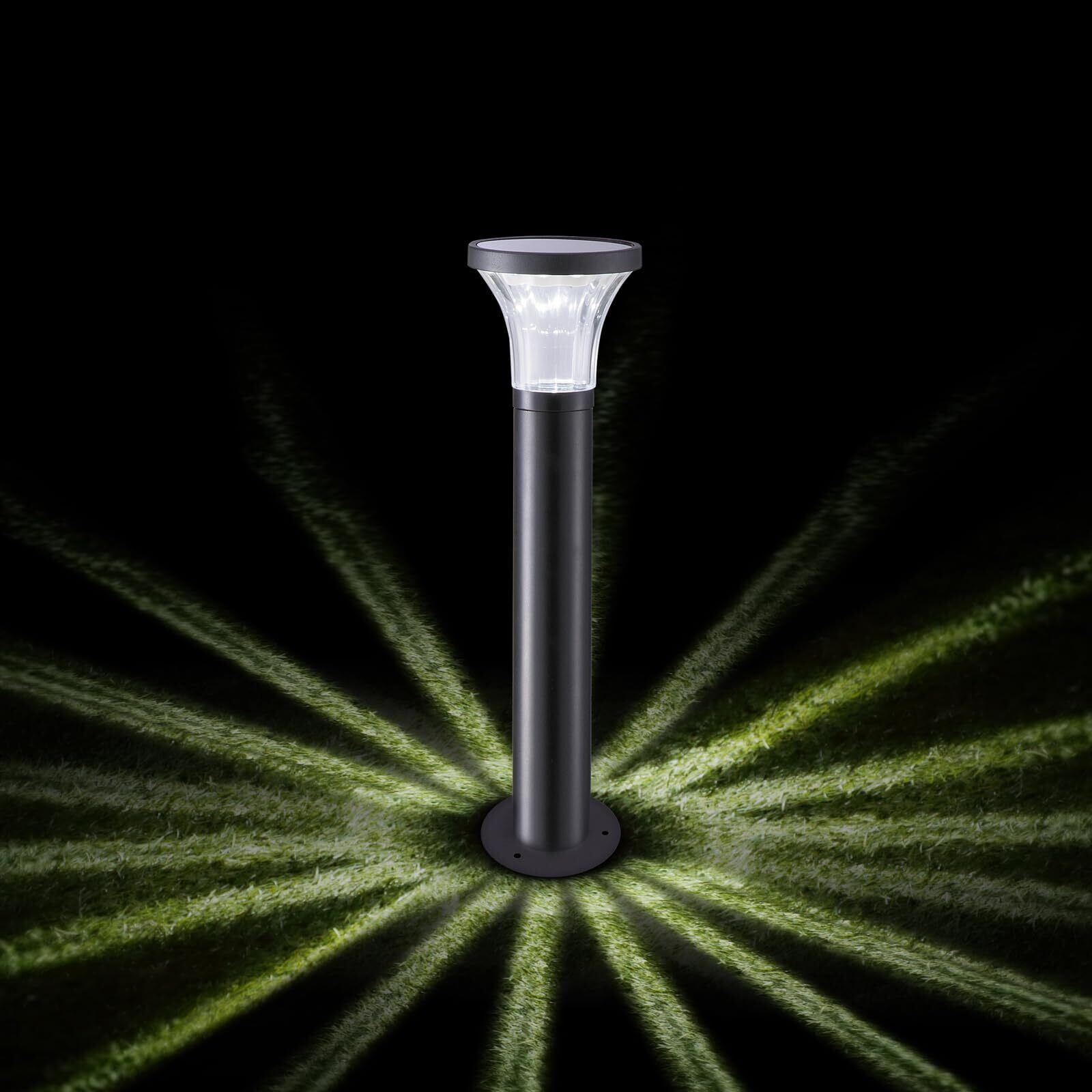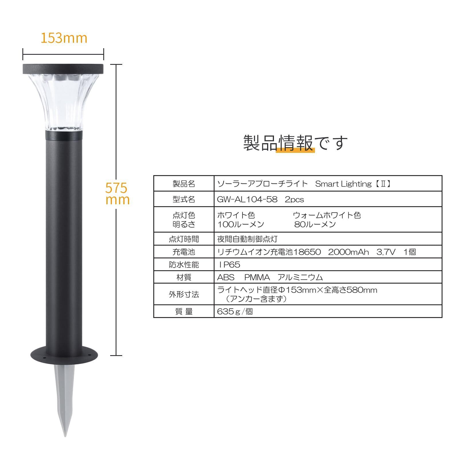 【仕様】点灯:ホワイト色、電球色(スイッチ切り替え)、明るさ:100ルーメン、夜間自動制御点灯、材質:ガラス透明ガラス(放射光を映し出す)、アルミ、ABS、内蔵:高品質ソーラーパネル、防水性:IP65、リチウムイオン充電池 18650 ( 3.7V、2000mAh) 寸法:ライトヘッド直径Φ15.3㎝×高さ58㎝ 質量:635g/個
