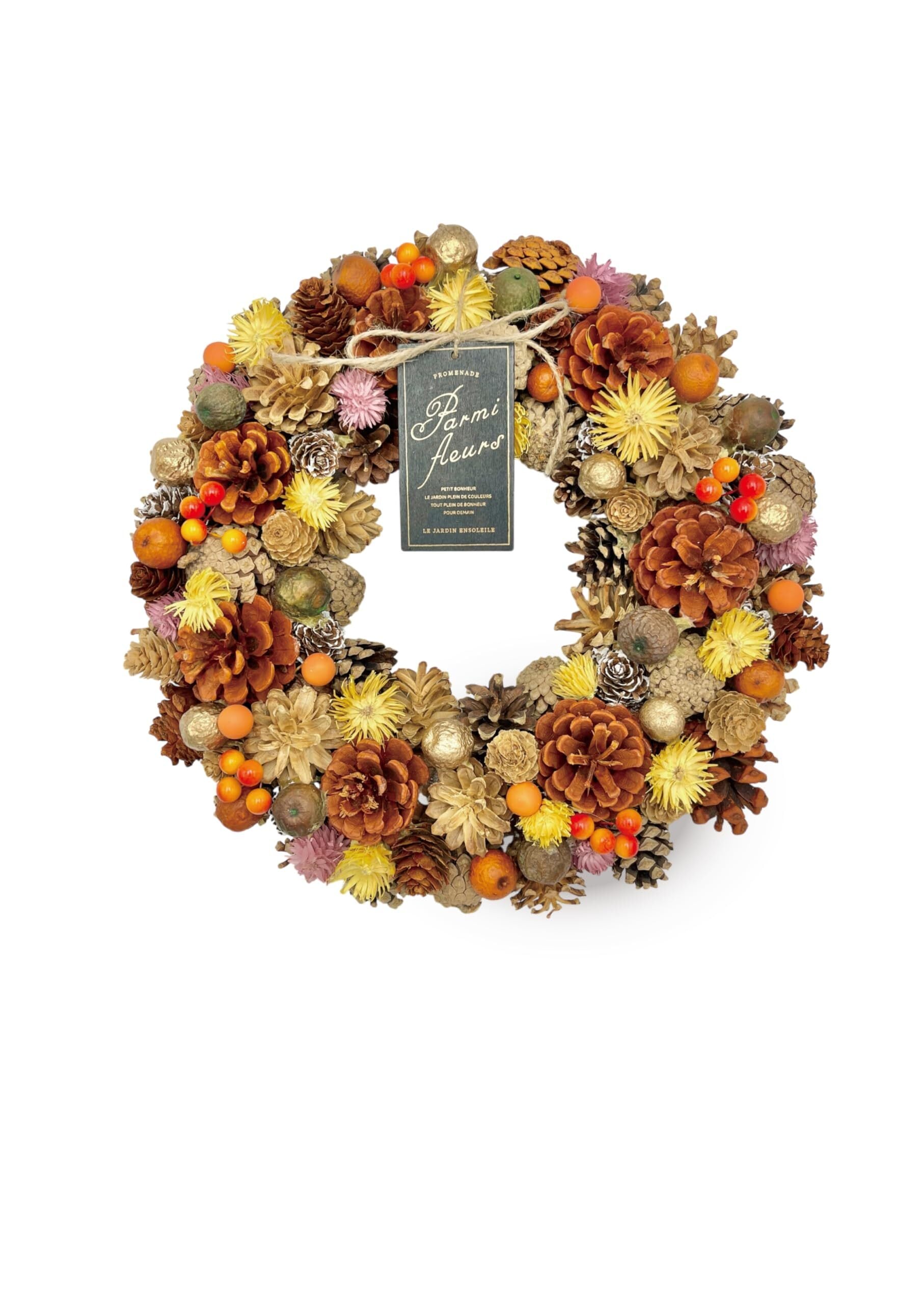 ■素材について■ 天然素材を使用したフラワーリースです。 木をスライスしてお花に見立てたり、葉っぱをドライにして色を染めたりと天然素材を加工しています。 <BR> 後ろの部分に麻紐が付いております、ひっかけて飾ってください。 ※以上の内容はする説明ではございません。予めご了承ください。
