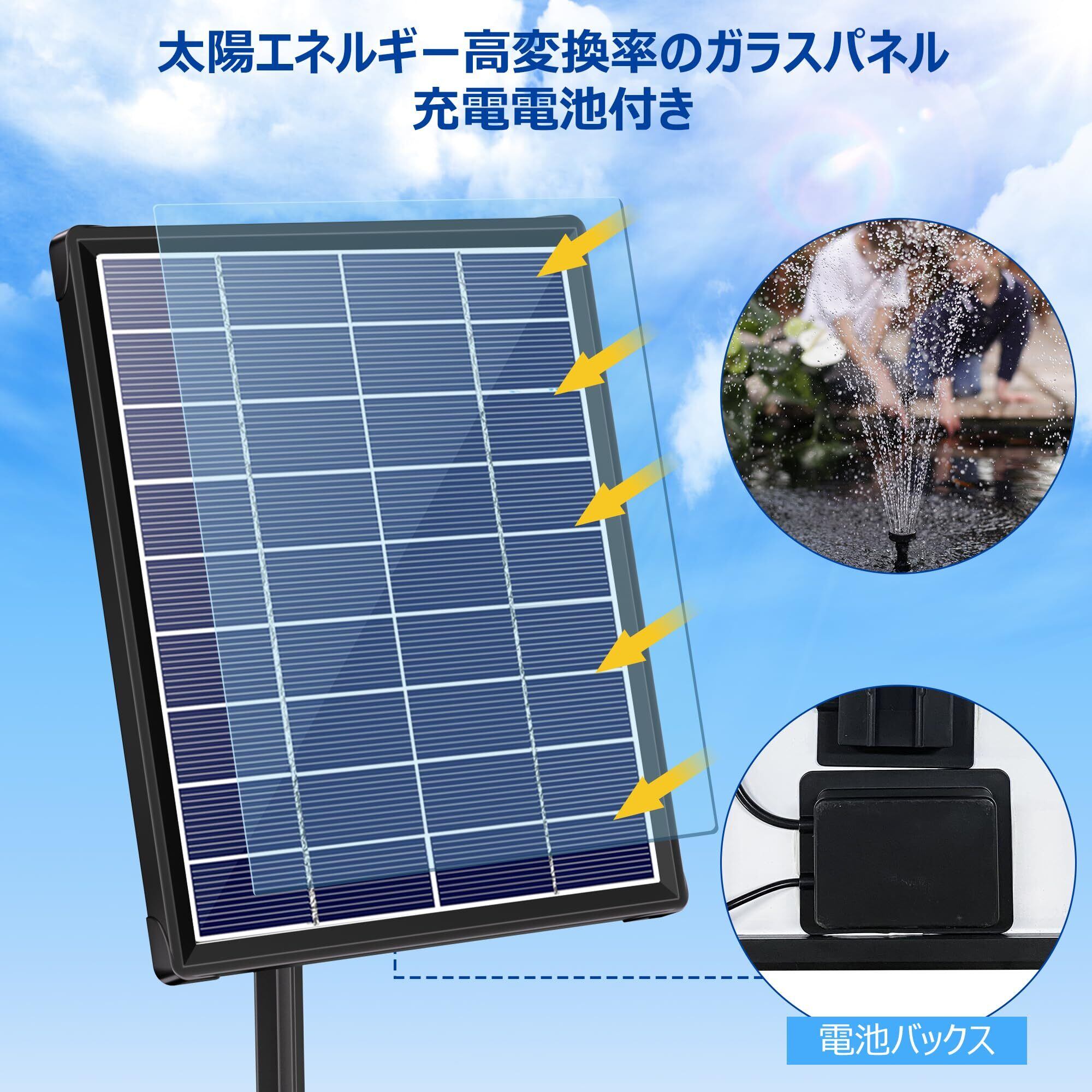 「3000mAh充電電池」このソーラーポンプ 屋外はアップグレードされたソーラー ポンプです。予備電池3000 mAhは夜は動作しない設置で、太陽が強い時に、噴水しながら充電可能です。蓄えた電力は曇りやかすかな日差しでも動作します。