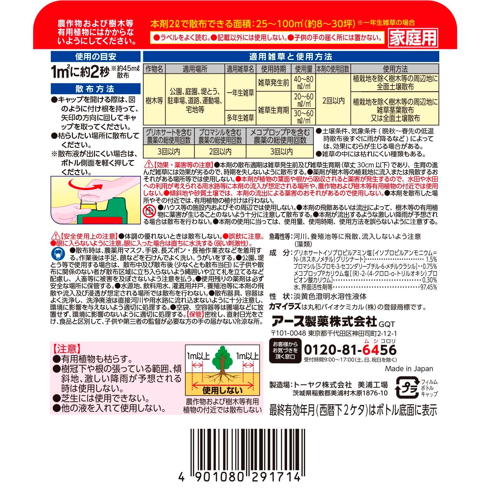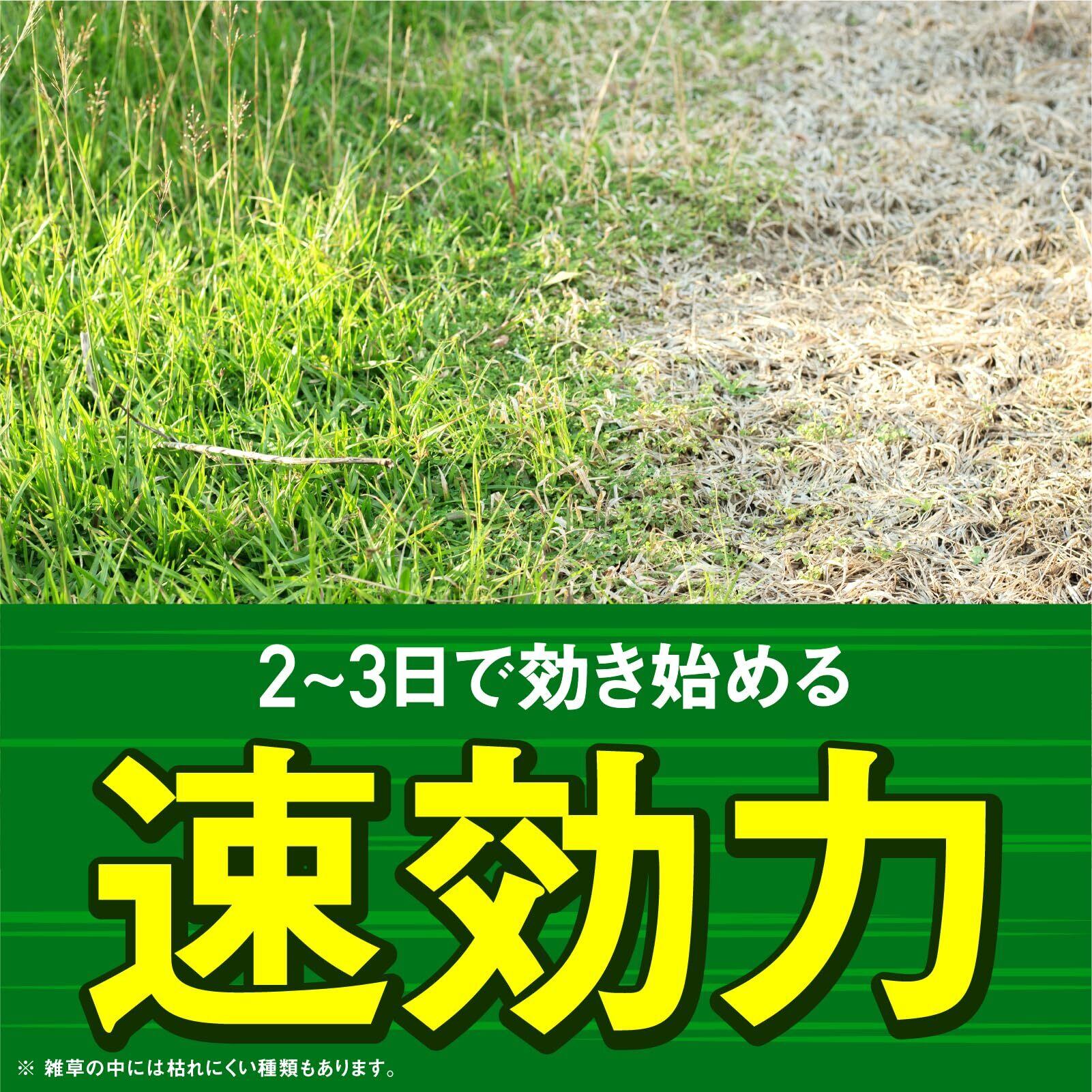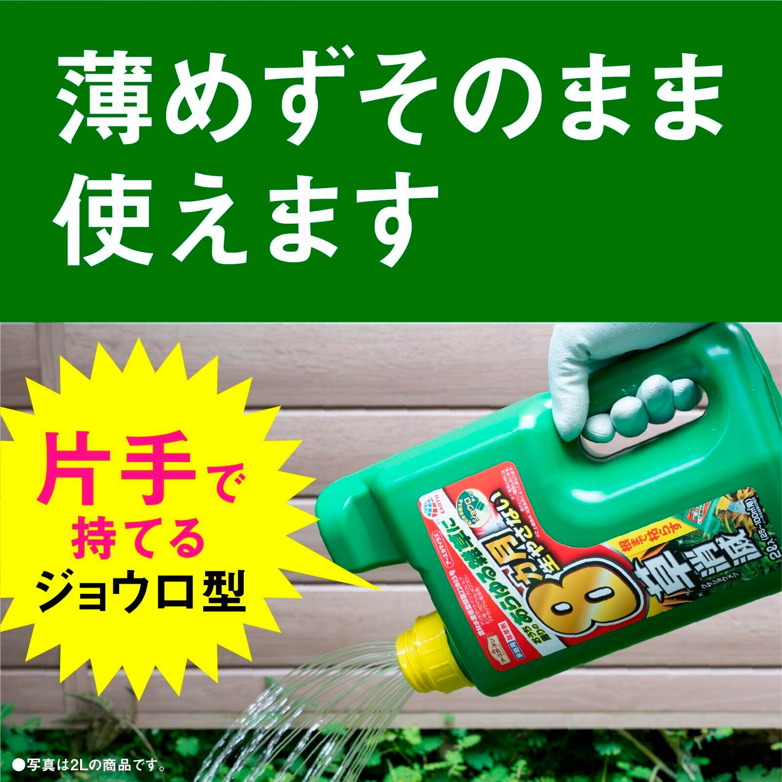 ●ひと夏生えない! 速効性と持続性散布してから2~10日で雑草は枯れ始め、約4~6ヵ月間、雑草の繁殖を抑えます。しつこいスギナや生育期(草丈30cm以下)の雑草にもよく効きます。土にまいても、茎葉にかけても、根まで枯らし、枯れムラが少ない強力処方です。※土壌条件、気象条件により効果にムラが生じることがあります。◆3つの有効成分の働きでしっかり雑草を枯らします! グリホサートイソプロピルアミン塩:部分的にかかっても、茎葉に浸透吸収し効果のムラが起きにくい有効成分。速効的に効果を発揮。ブロマシル:雨で流されにくく、4~5ヵ月間雑草の生育を抑制。メコプロップPカリウム塩:スギナなどしつこい雑草にも効果を発揮する有効成分。●たっぷり大容量2Lサイズ 広範囲にまきやすいジョウロヘッド採用! 本剤2Lで散布できる面積:約33~66m2(約10~20坪)【 効果・薬害等の注意 】 ・薬剤が樹木等の植栽地に流入または飛散するおそれがある場所等では使用しない。・本剤が植物の葉面や根から吸収されると薬害が発生するので、水田や水田への利用が考えられる用水路等に本剤の流入が想定される場所や、農作物および樹木等有用植物の付近では使用しない。・傾斜地や砂質土壌では、本剤の流出による薬害の恐れがあるので使用しない。・本剤を散布した場所やその付近では、有用植物の植付けは行わない。・ハウス等の施設内およびその周辺では使用しない。・本剤の飛散あるいは流出によって、樹木等の有用植物に薬害が生じることのないよう十分に注意して散布する。・本剤が流出するような激しい降雨が予想される場合は散布を行わない。・本剤の使用に当っては、使用量、使用時期、使用方法を誤らないように注意する。【 安全使用上の注意 】 ・体調の優れないときは、散布しない。・誤飲に注意する。・眼に入らないように注意。眼に入った場合には直ちに水洗する(弱い刺激性)。・散布時は農薬用マスク、手袋、長ズボン・長袖の作業衣などを着用する。作業後は手足・顔などを石けんでよく洗い、うがいをする。・公園、堤とう等で使用する場合は、散布中及び散布後(少なくとも散布当日)に小児や散布に関係のない者が散布区域に立ち入らないよう縄囲いや立て札を立てるなど配慮し、人畜等に被害を及ぼさないよう注意を払う。・使用残りの薬剤は必ず安全な場所に保管する。・水源地、飲料水、灌漑用井戸、養殖池等に本剤の飛散や流入及び浸透が想定される場所では散布を行わない。・散布器具、容器はよく洗浄し、洗浄廃液は直接河川や用水路に流れ込まないように十分注意し、環境に影響を与えないよう適切に処理する。・空袋、空容器等は圃場などに放置せず、環境に影響のないよう適切に処理する。【 保管上の注意 】 ・直射日光をさけ、食品と区別して、子供の手の届かないなるべく低温な場所に密栓して保管する。【 注意 】・農作物および樹木等 有用植物の付近では散布しない。・農作物および樹木等、有用植物にはかからないようにしてください。・樹冠下や根の張っている範囲、傾斜地、激しい降雨が予想される時は使用しない。・芝生には使用できない。・他の液を入れて使用しない。魚毒性等 水産動植物(藻類)に影響あり。河川、養殖池等周辺での使用はさける。 原材料・成分 【有効成分】グリホサートイソプロピルアミン塩 1.5%、ブロマシル 0.75%、メコプロップPカリウム塩 0.30% 【性状】淡黄色澄明水溶性液体 ご注意(免責)>必ずお読みください 【 効果・薬害等の注意 】 ● 薬剤が樹木等の植栽地に流入または飛散するおそれがある場所等では使用しない。 ● 本剤が植物の葉面や根から吸収されると薬害が発生するので、水田や水田への利用が考えられる用水路等に本剤の流入が想定される場所や、農作物および樹木等有用植物の付近では使用しない。 ● 傾斜地や砂質土壌では、本剤の流出による薬害の恐れがあるので使用しない。 ● 本剤を散布した場所やその付近では、有用植物の植付けは行わない。 ● ハウス等の施設内およびその周辺では使用しない。 ● 本剤の飛散あるいは流出によって、樹木等の有用植物に薬害が生じることのないよう十分に注意して散布する。 ● 本剤が流出するような激しい降雨が予想される場合は散布を行わない。 ● 本剤の使用に当っては、使用量、使用時期、使用方法を誤らないように注意する。 【 安全使用上の注意 】 ● 体調の優れないときは、散布しない。 ● 誤飲に注意する。 ● 眼に入らないように注意。眼に入った場合には直ちに水洗する(弱い刺激性)。 ● 散布時は農薬用マスク、手袋、長ズボン・長袖の作業衣などを着用する。作業後は手足・顔などを石けんでよく洗い、うがいをする。 ● 公園、堤とう等で使用する場合は、散布中及び散布後(少なくとも散布当日)に小児や散布に関係のない者が散布区域に立ち入らないよう縄囲いや立て札を立てるなど配慮し、人畜等に被害を及ぼさないよう注意を払う。 ● 使用残り