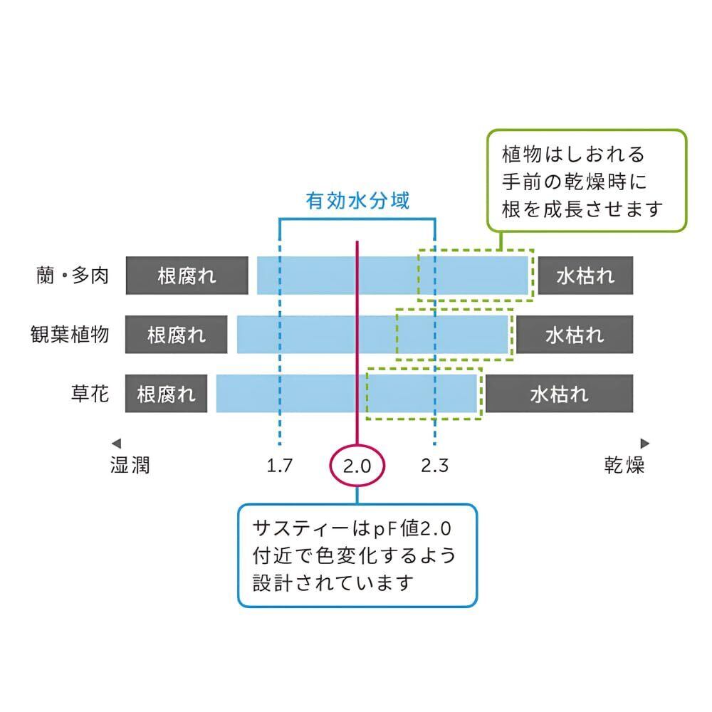 鉢の土に水がたっぷりある時はインジケーターが青色に、水が足りなくなると青色が白色に変化します。