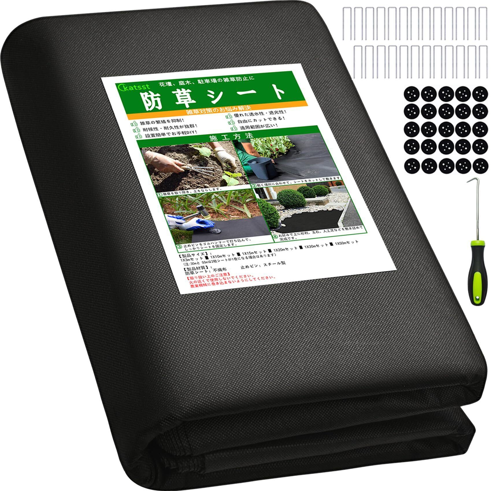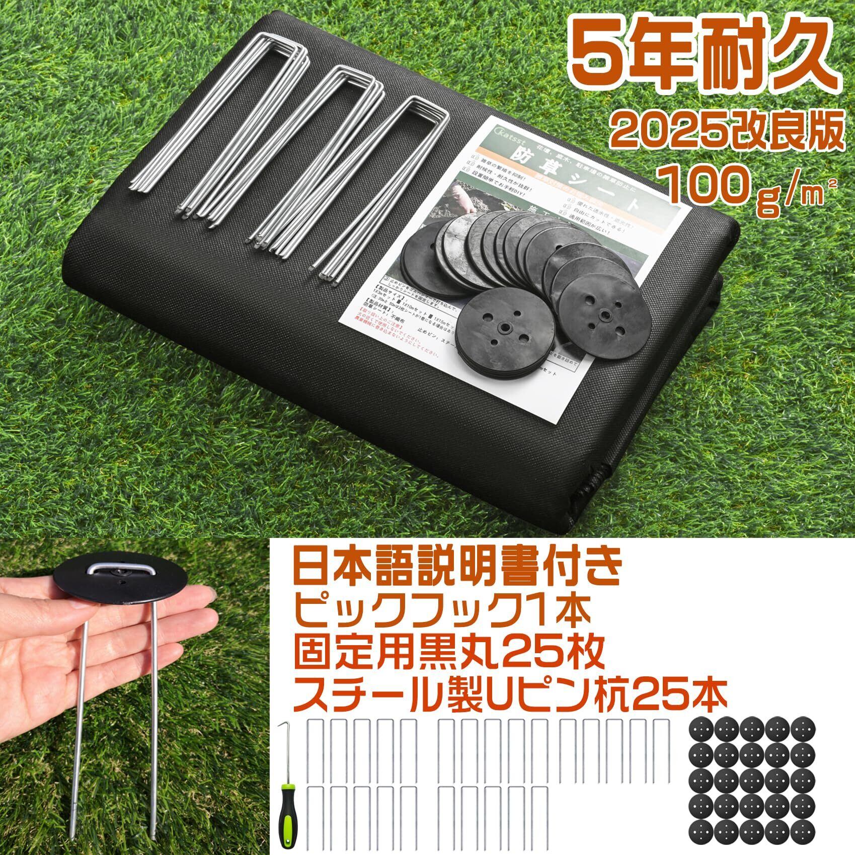 【2025最新】katsst【改良版】防草シート ぼうそうシート Uピン杭25本と黒丸25枚付き 1x10m 厚手 耐用年数は5年 雑草防止 除草シート ブラック (1x10m)