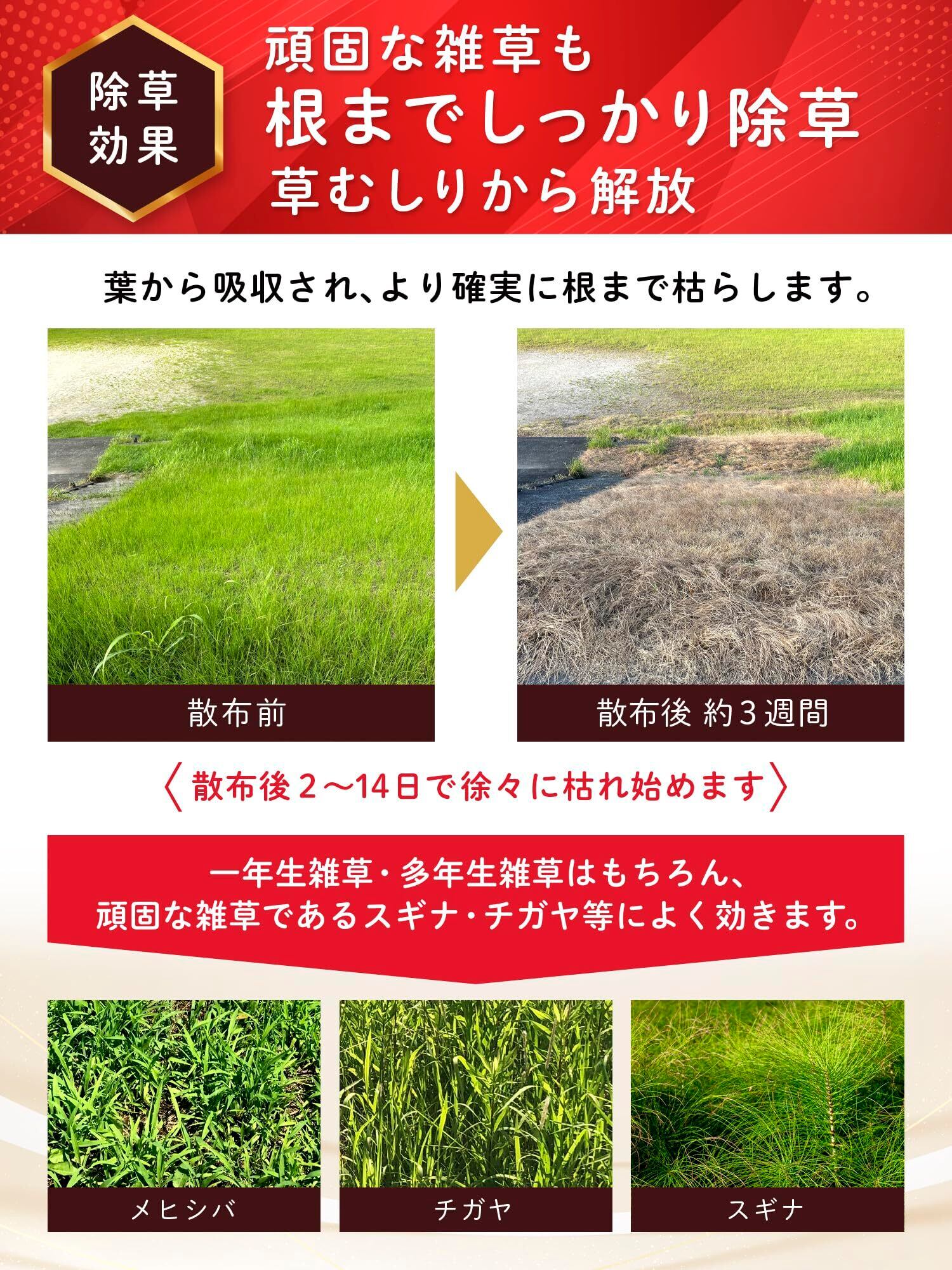 【強力な除草効果】植物の葉や茎から吸収され、根まで枯らす効果を発揮。約1週間で徐々に効果が現れ、約2週間で枯らします。