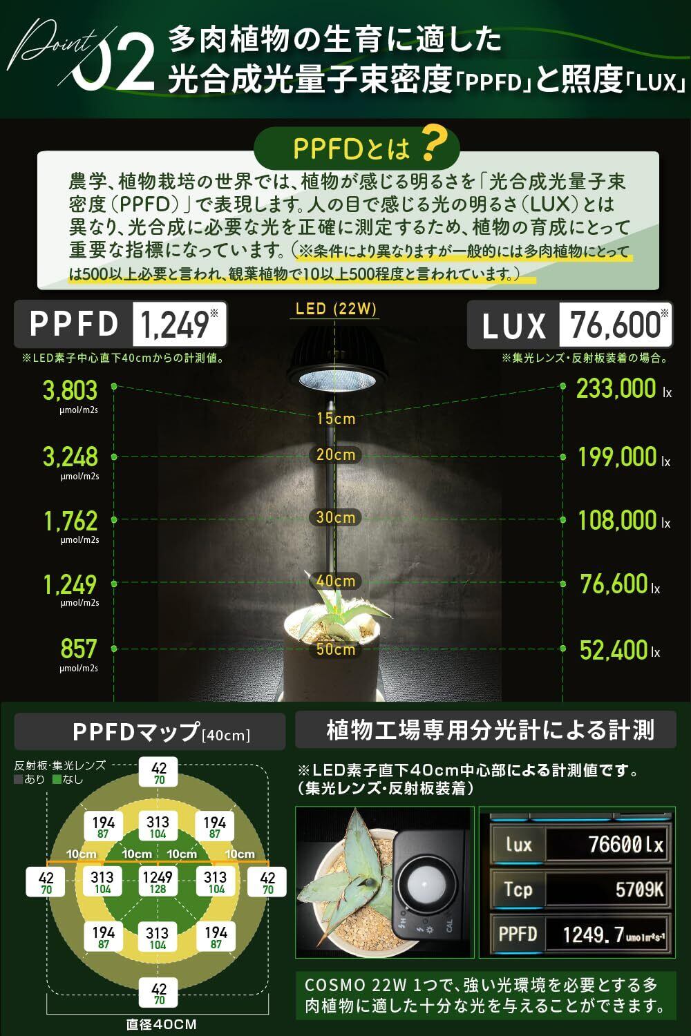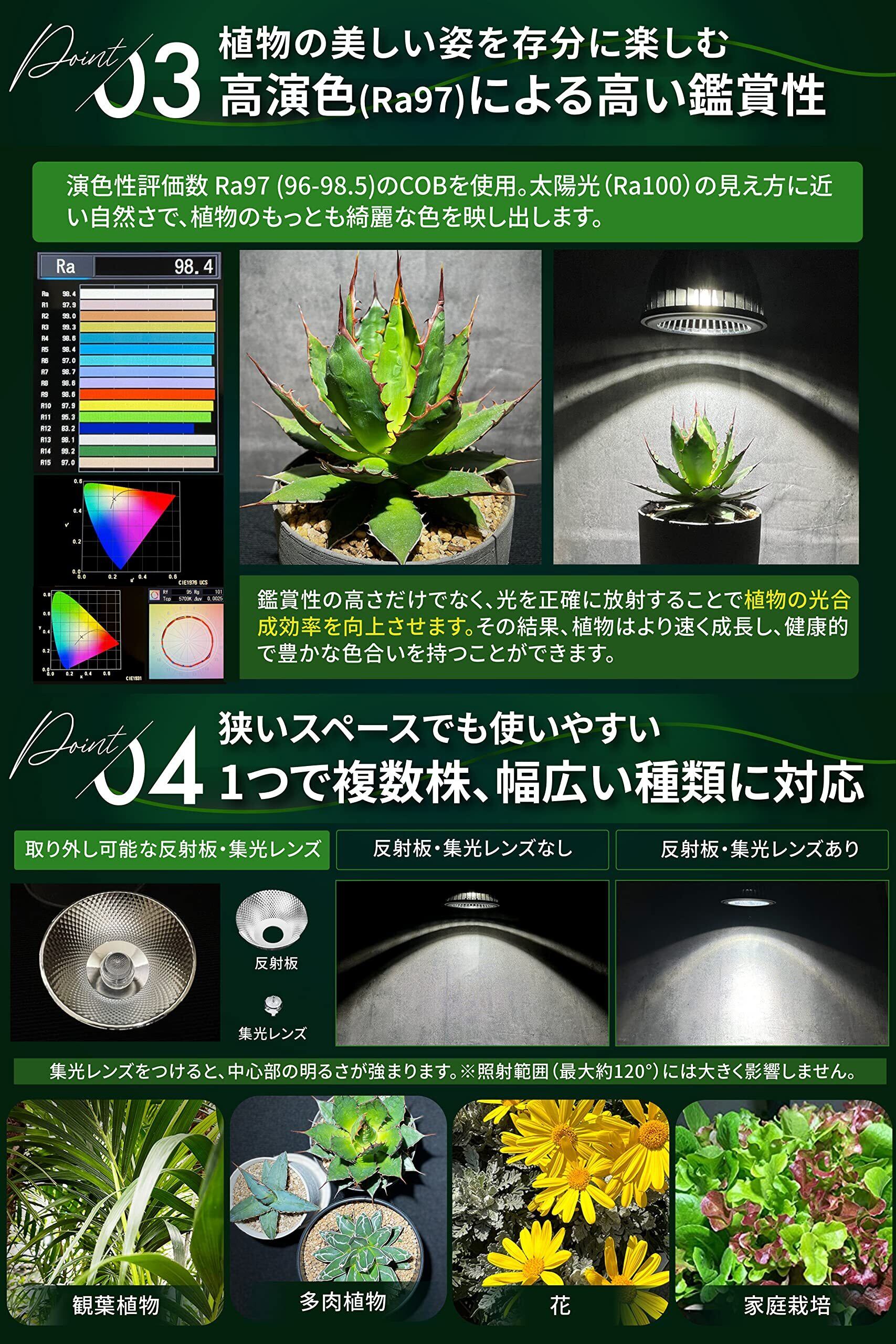 【高演色(Ra97-98.5)による高い鑑賞性】 演色性評価数(Ra97-98.5)のCOBを使用。 太陽光 (Ra100)の見え方に近い自然さで、 植物のもっとも綺麗な色を映し出します。鑑賞性の高さだけでなく、光を正確に放射することで植物の光合成効率を向上させます。 その結果、 植物はより速く成長し健康的で豊かな色合いを持つことができます。また、取り外し可能な反射板・集光レンズ付き。120°の広範囲照射で2株しっかりカバーします。